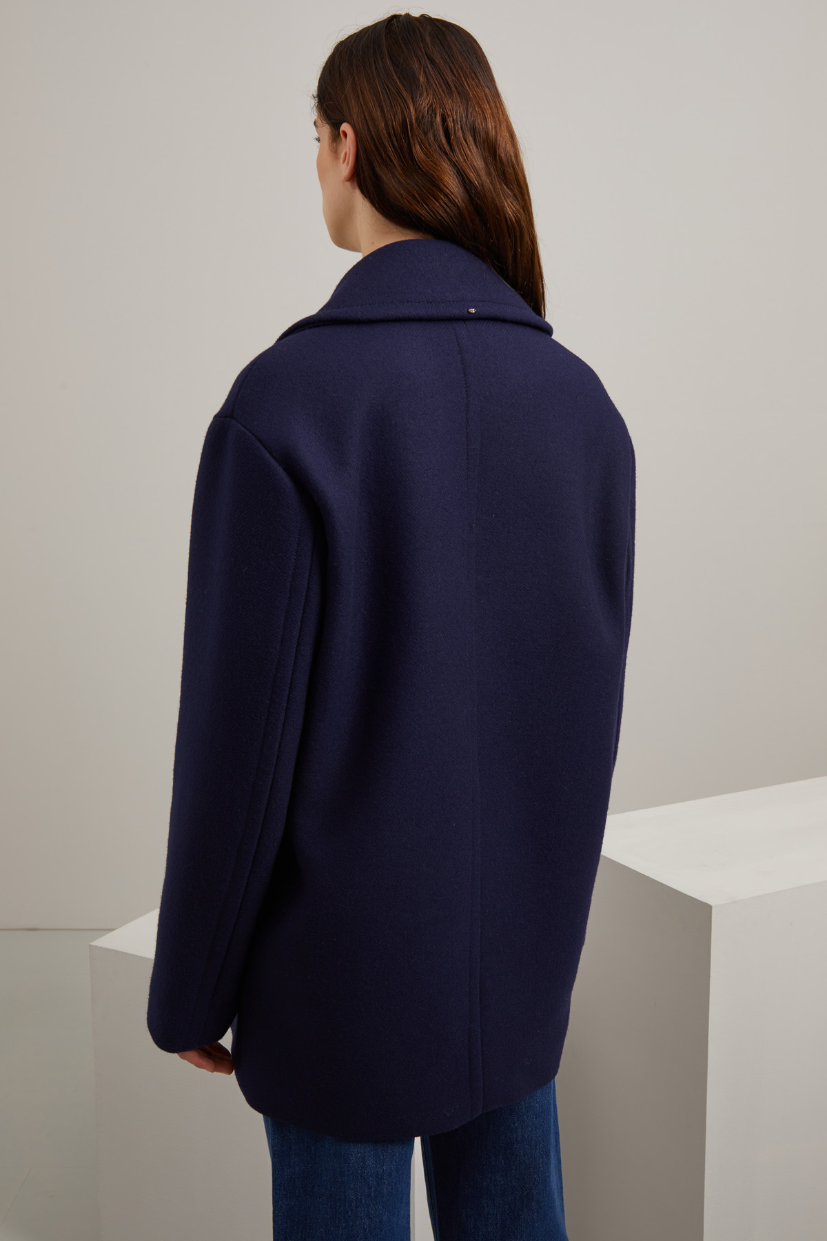 Cappotto dalla linea dritta realizzato in tessuto pesante di misto lana, con collo a rever, maniche lunghe, tasche a filettone e a doppio filetto con patta sul davanti. Allacciatura doppiopetto tramite maxi bottoni in metallo. Foderato.
