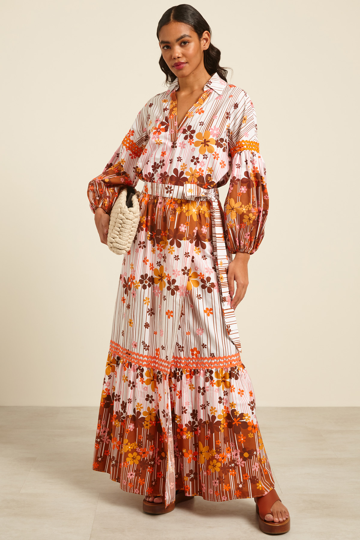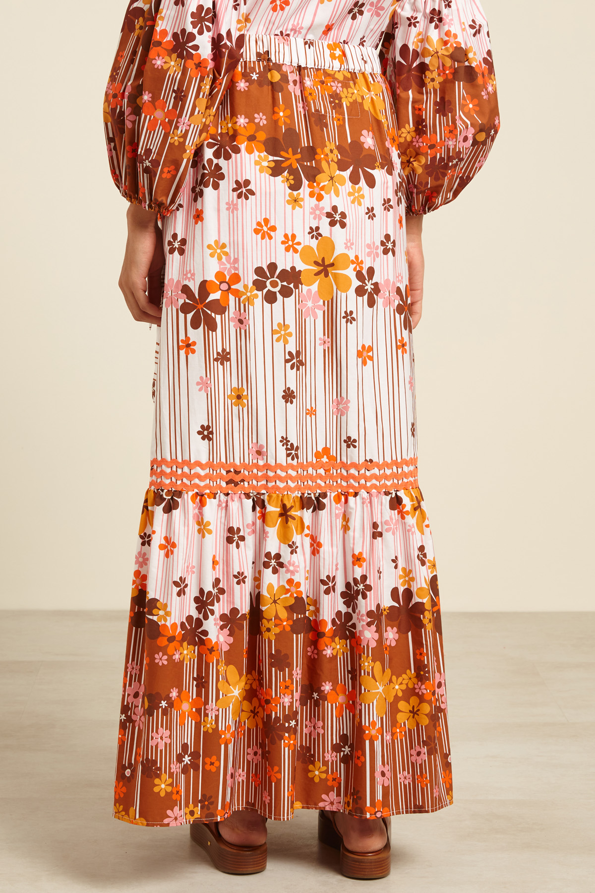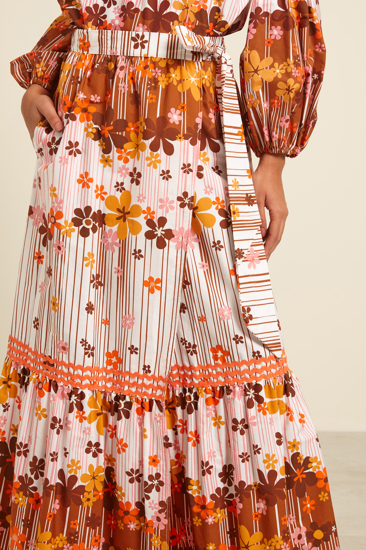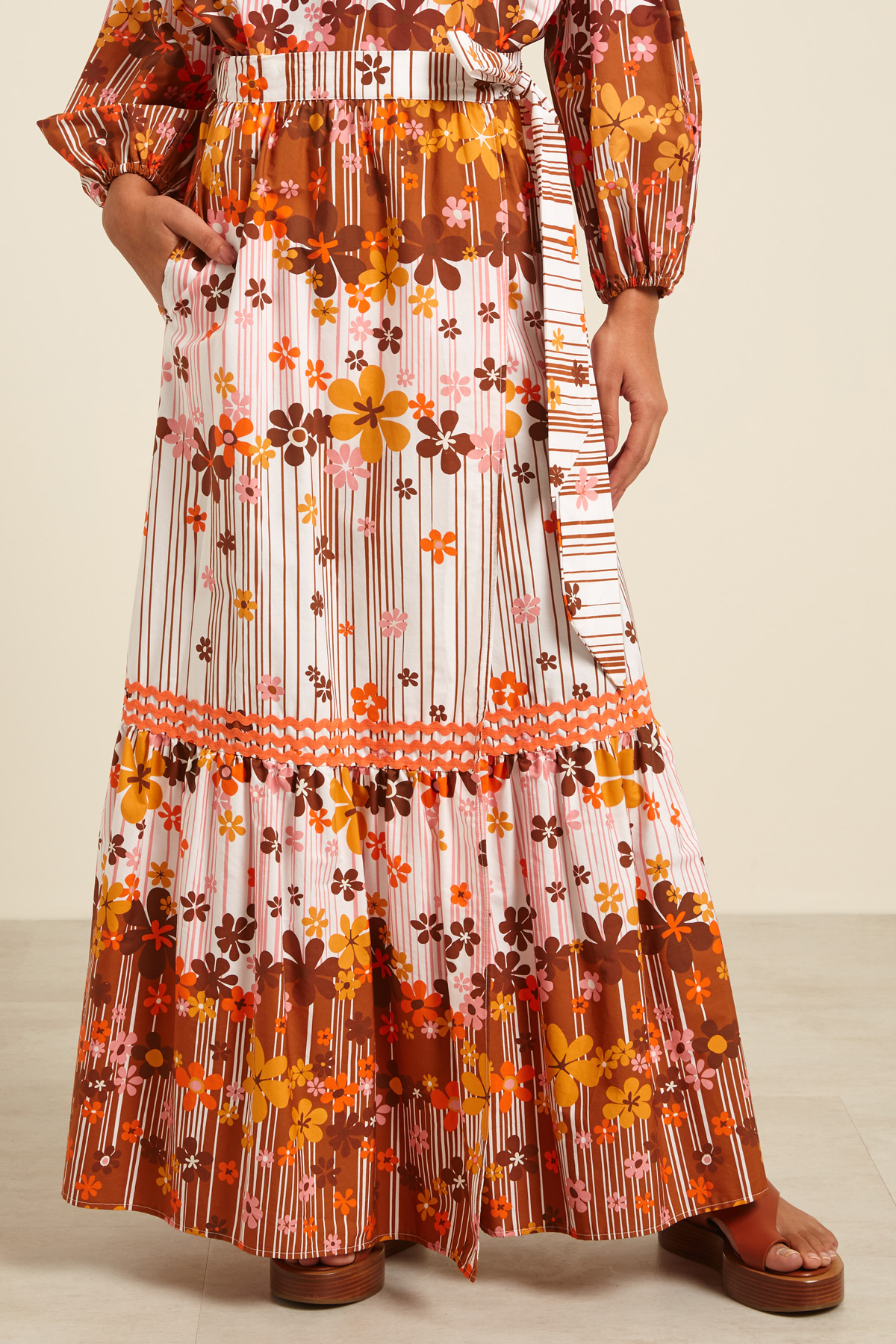 Gonna lunga a portafoglio dalla linea ampia realizzata in popeline di puro cotone stampato, con cintone in vita, tasche laterali inserite in cucitura, dettaglio di passamaneria ondulata e balza al fondo. Allacciatura tramite nastri da annodare sul fianco e bottone.