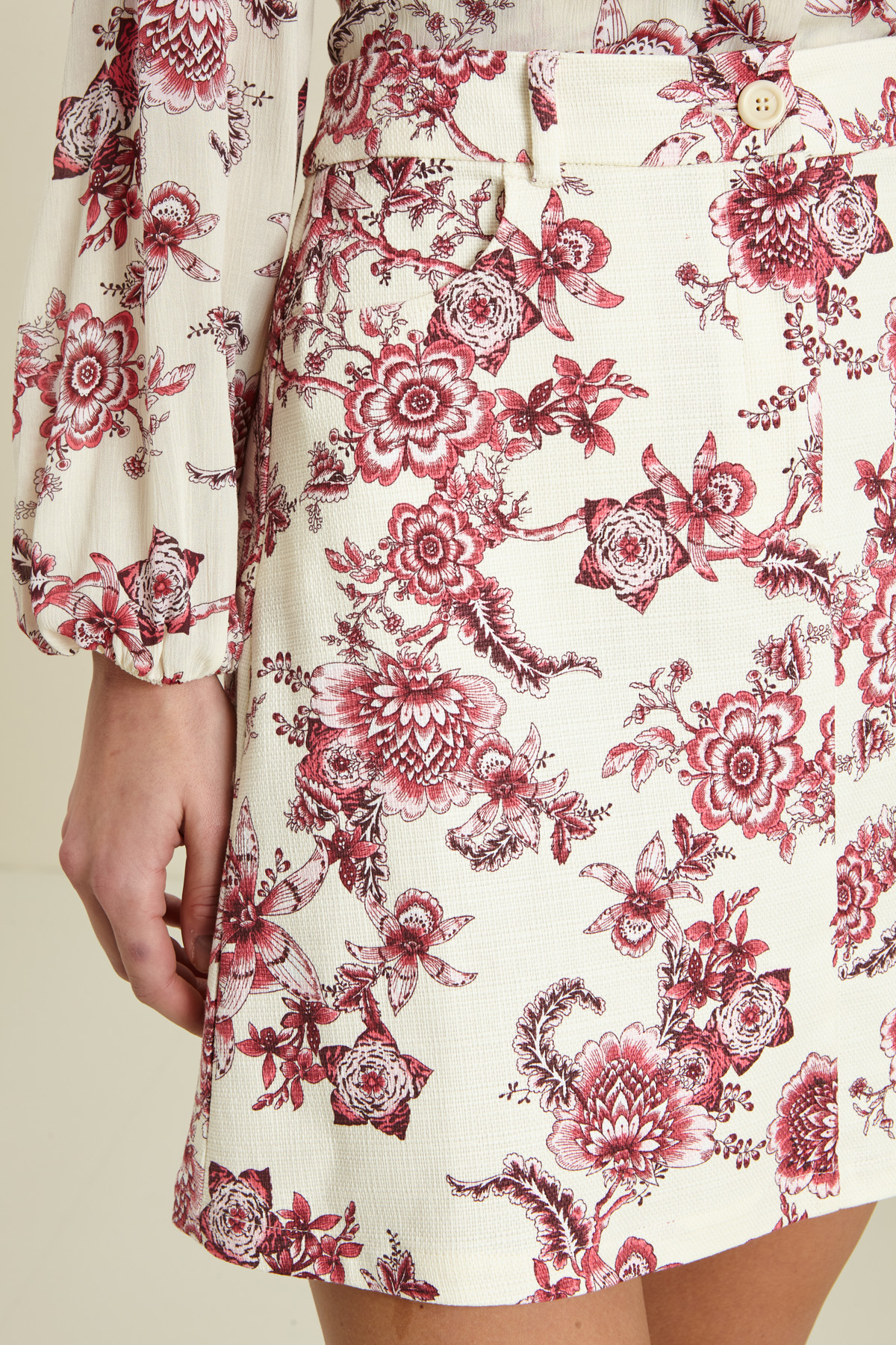 Minigonna dalla linea ad A realizzata in stuoia di cotone stretch stampato, con passanti in vita, tasche laterali alla francese e allacciatura tramite zip nascosta e bottone.