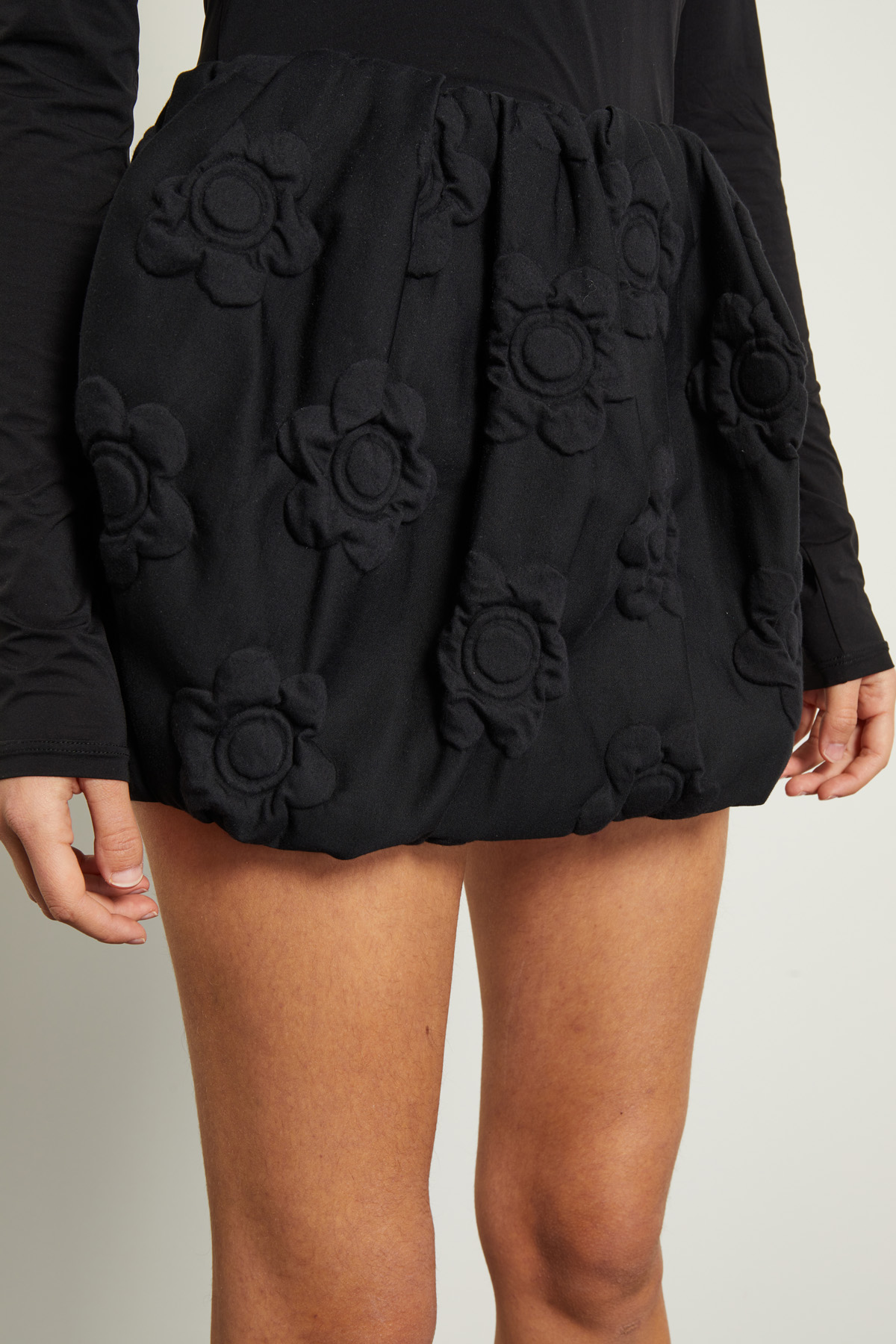 Minigonna a palloncino realizzata in matelassè di misto cotone, con dettagli a rilievo e inserto elastico in vita. Foderata.