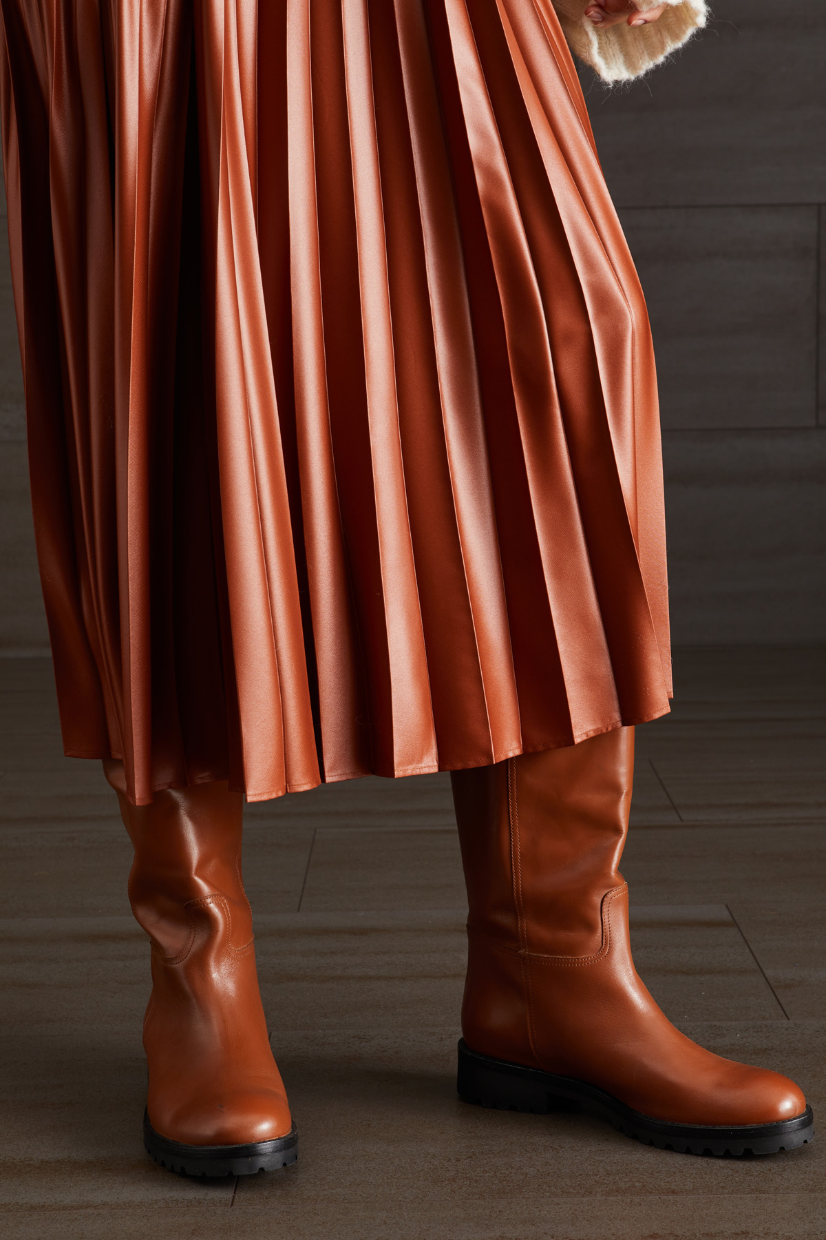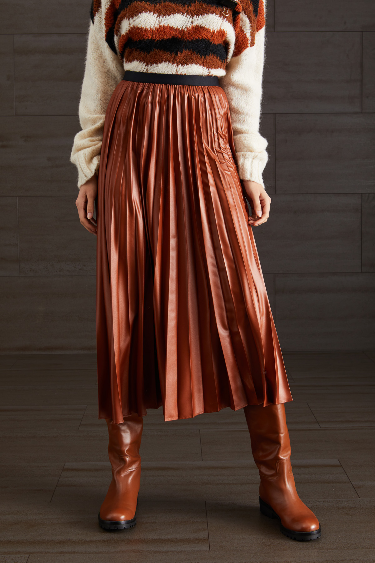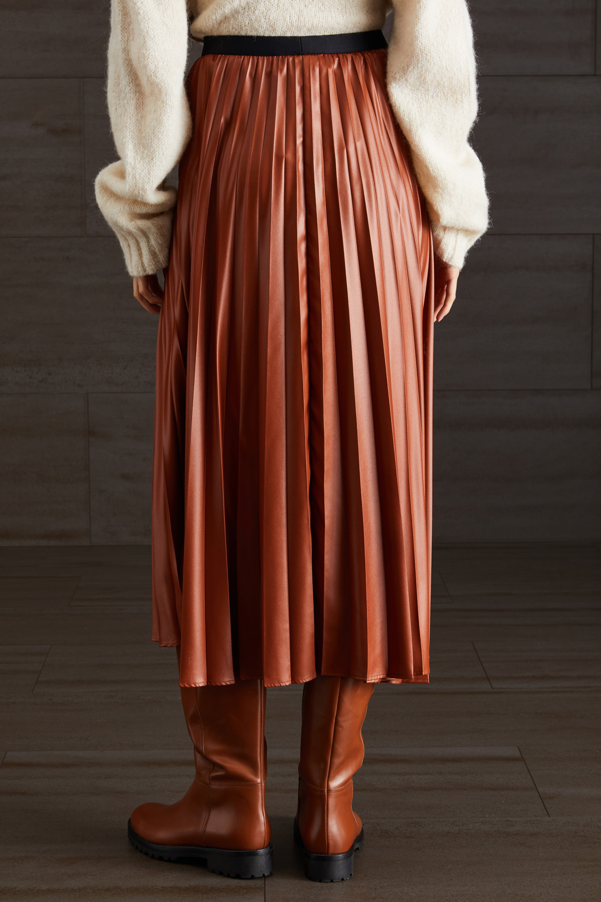 Gonna midi dalla linea morbida realizzata in raso con lavorazione plissè e inserto elastico in vita. Foderata.