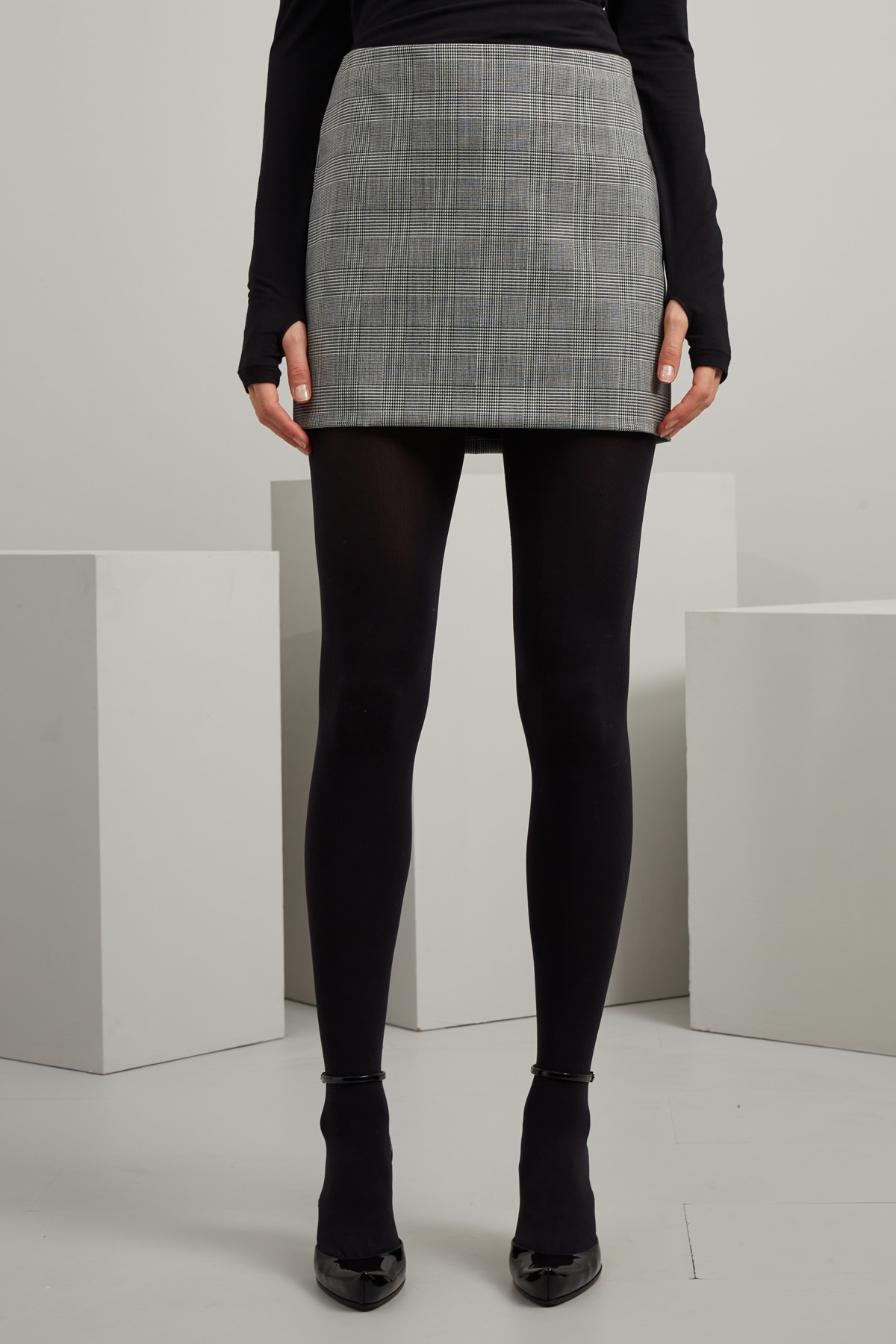 Minigonna in batavia di misto lana stretch tinto filo, con vita bassa e allacciatura tramite zip invisibile nel retro. Foderata.