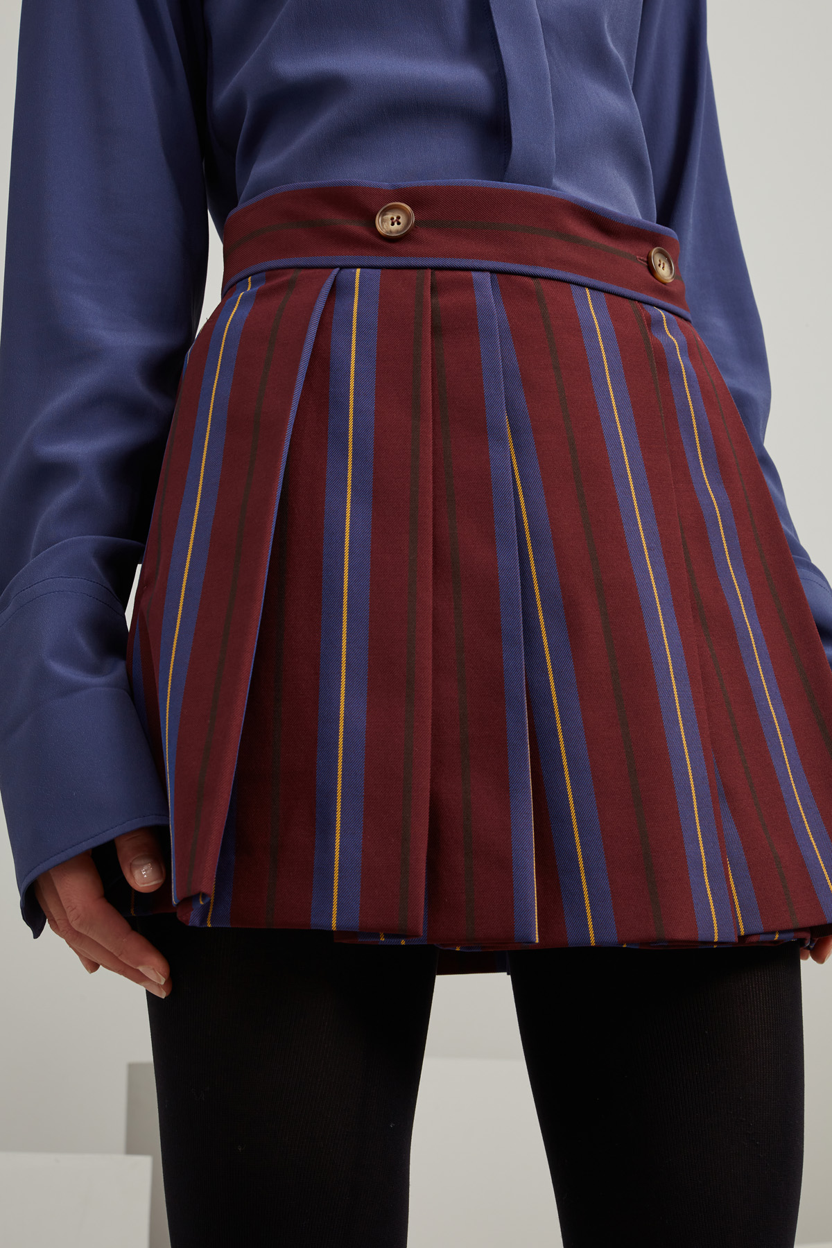 Gonna corta dalla linea a portafoglio realizzata in gabardina di misto lana tinto filo, con motivo di pieghe cucite, cintone in vita, tasche laterali inserite in cucitura e allacciatura tramite bottoni. Foderata.