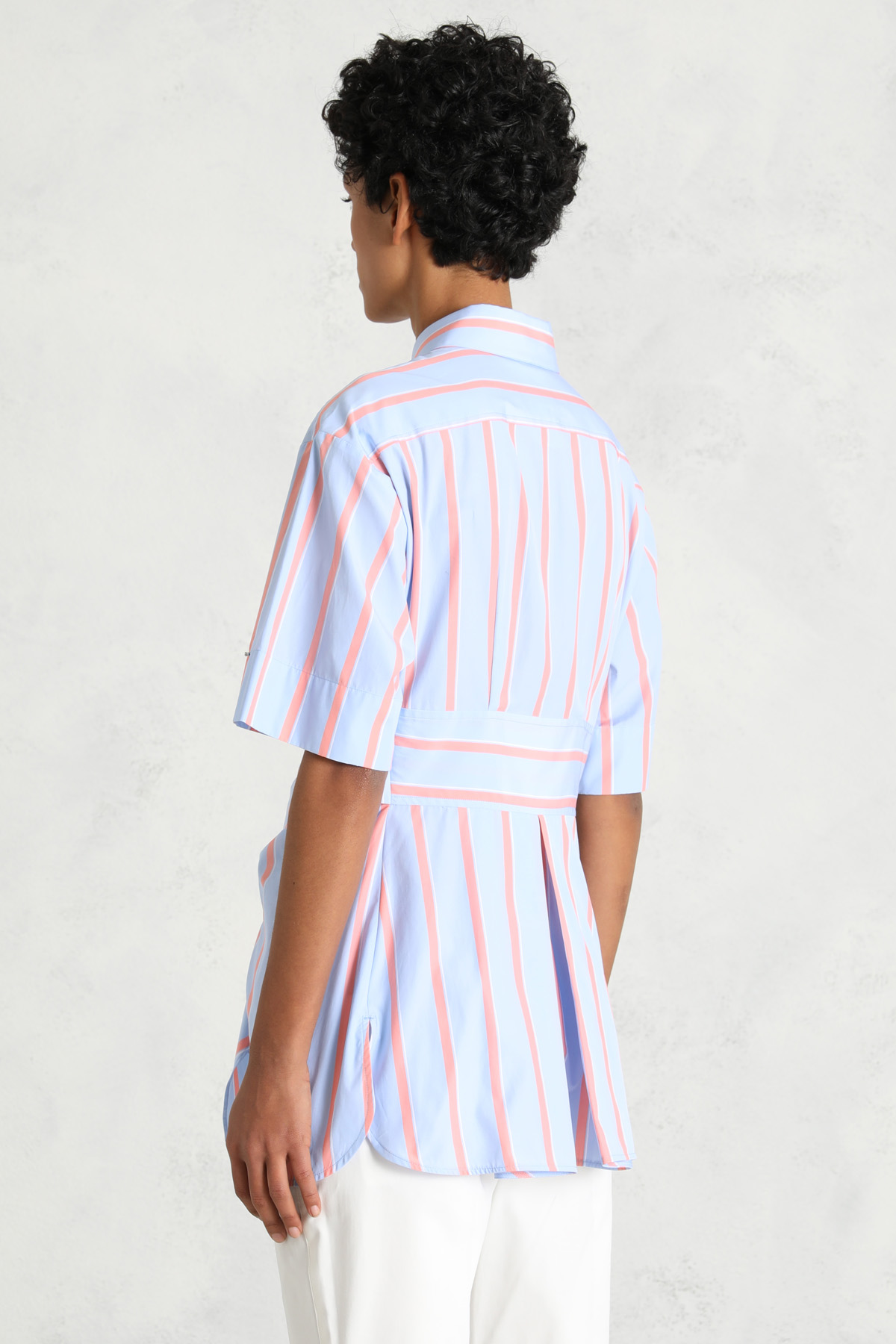 Camicia realizzata in popeline di cotone, con colletto classico, taschino applicato sul petto, maniche corte e contropiego sul retro. Chiusura coperta con bottoni e fiocco che si annoda alla vita.