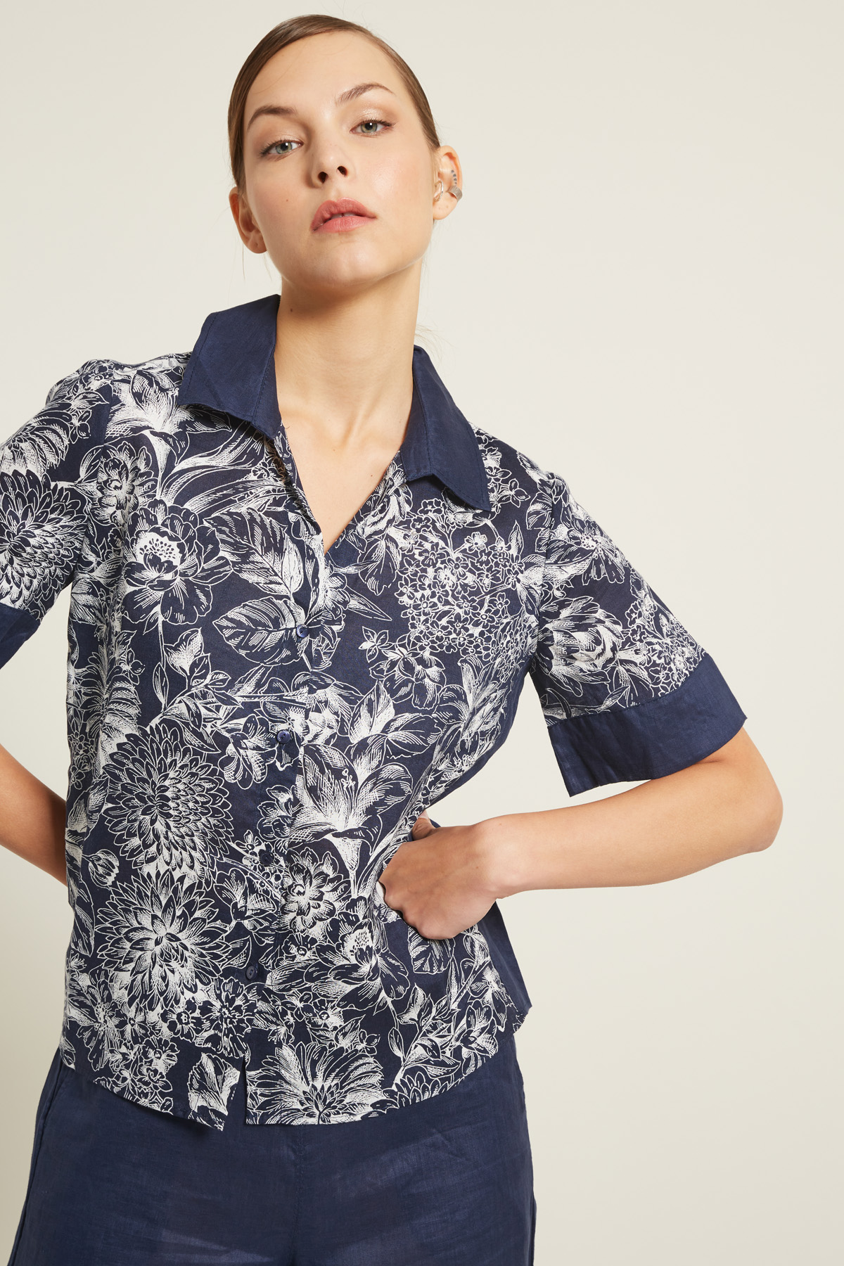 Camicia dalla linea dritta realizzata in tela di puro lino stampato, con colletto stile polo, maniche corte, carrè nel retro e profili a contrasto. Allacciatura tramite bottoni.