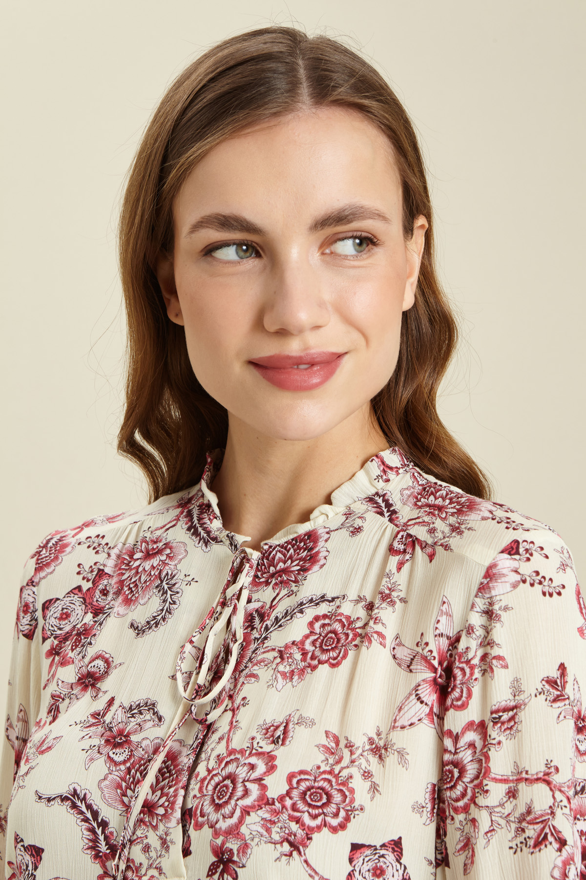 Blusa dalla linea fluida realizzata in creponne di pura viscosa stampata, con collo a foulard rifinito da rouches e apertura a V sul davanti, maniche lunghe con inserto elastico al fondo e dettaglio di piega cucita.