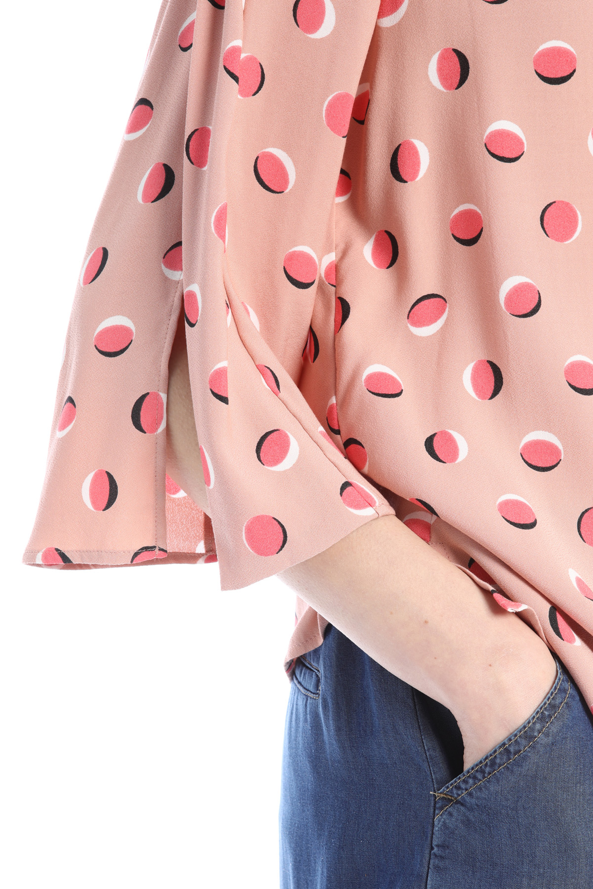 Blusa dalla linea dritta realizzata in sablè di viscosa stampato, con scollo a barchetta e maniche tre quarti con spacchi.