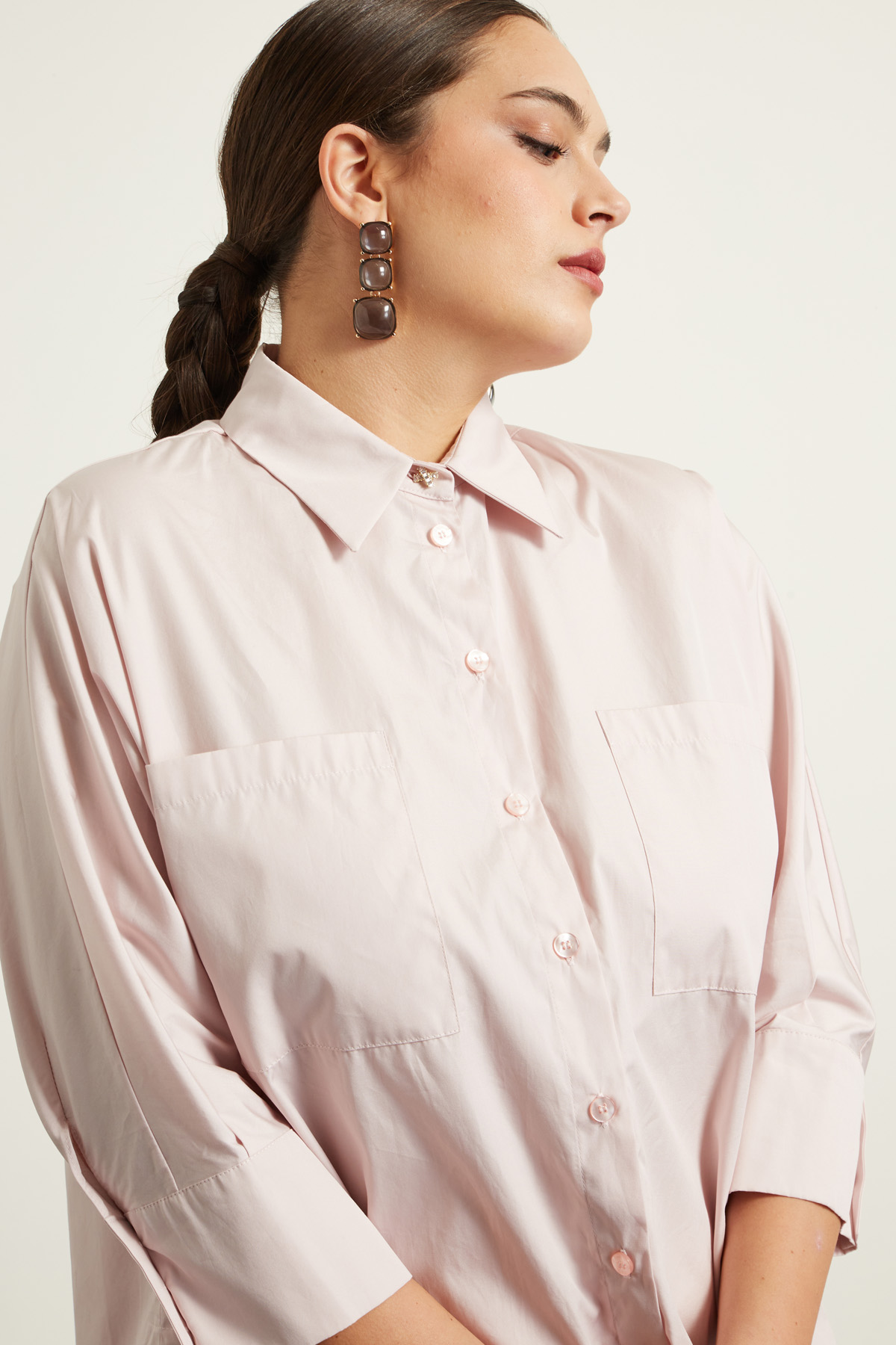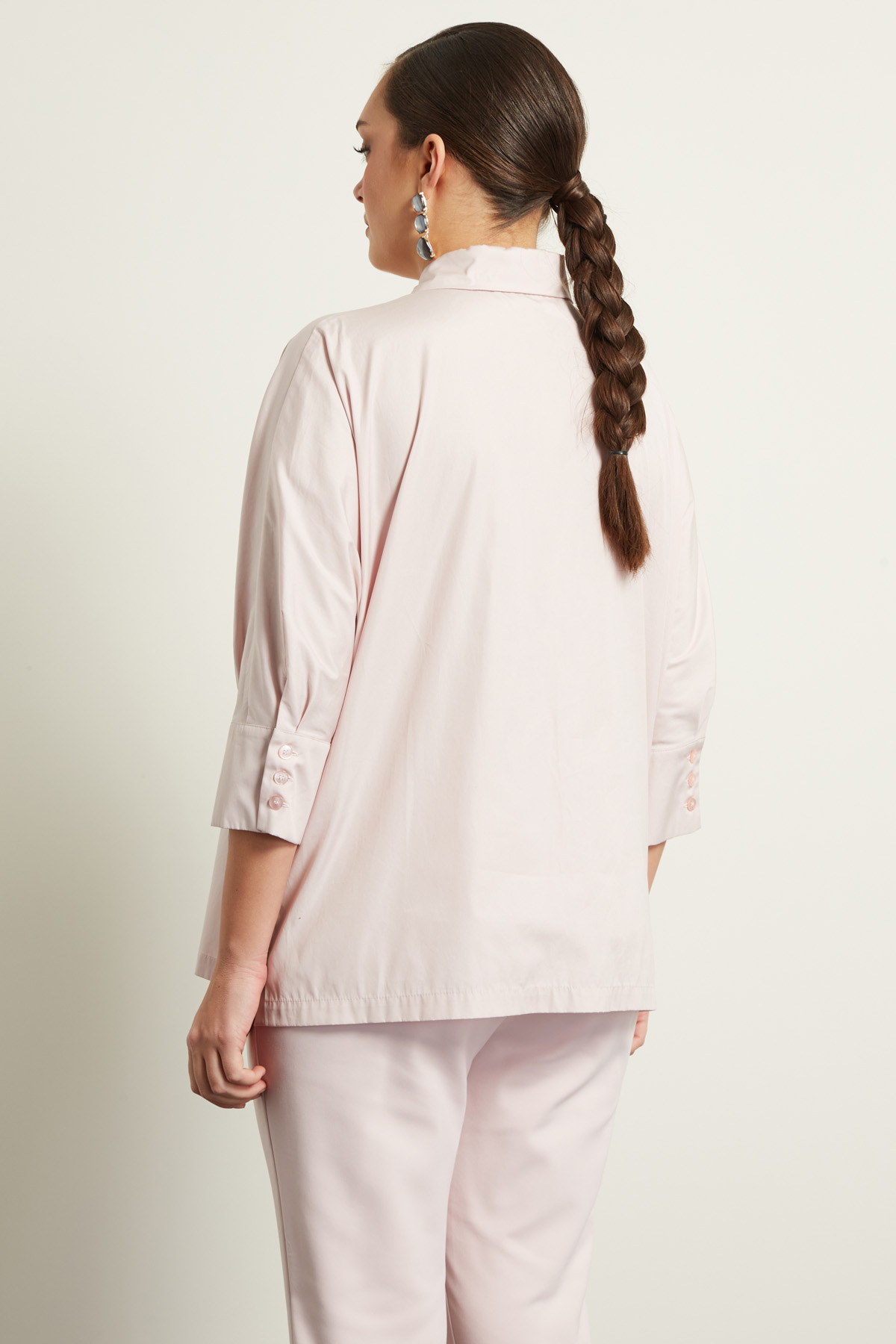 Camicia dalla linea dritta realizzata in popeline di puro cotone, con colletto classico, maniche tre quarti a kimono con maxi polsino e bottoni, tasche applicate al petto e spacchi laterali al fondo. Allacciatura tramite bottoni.