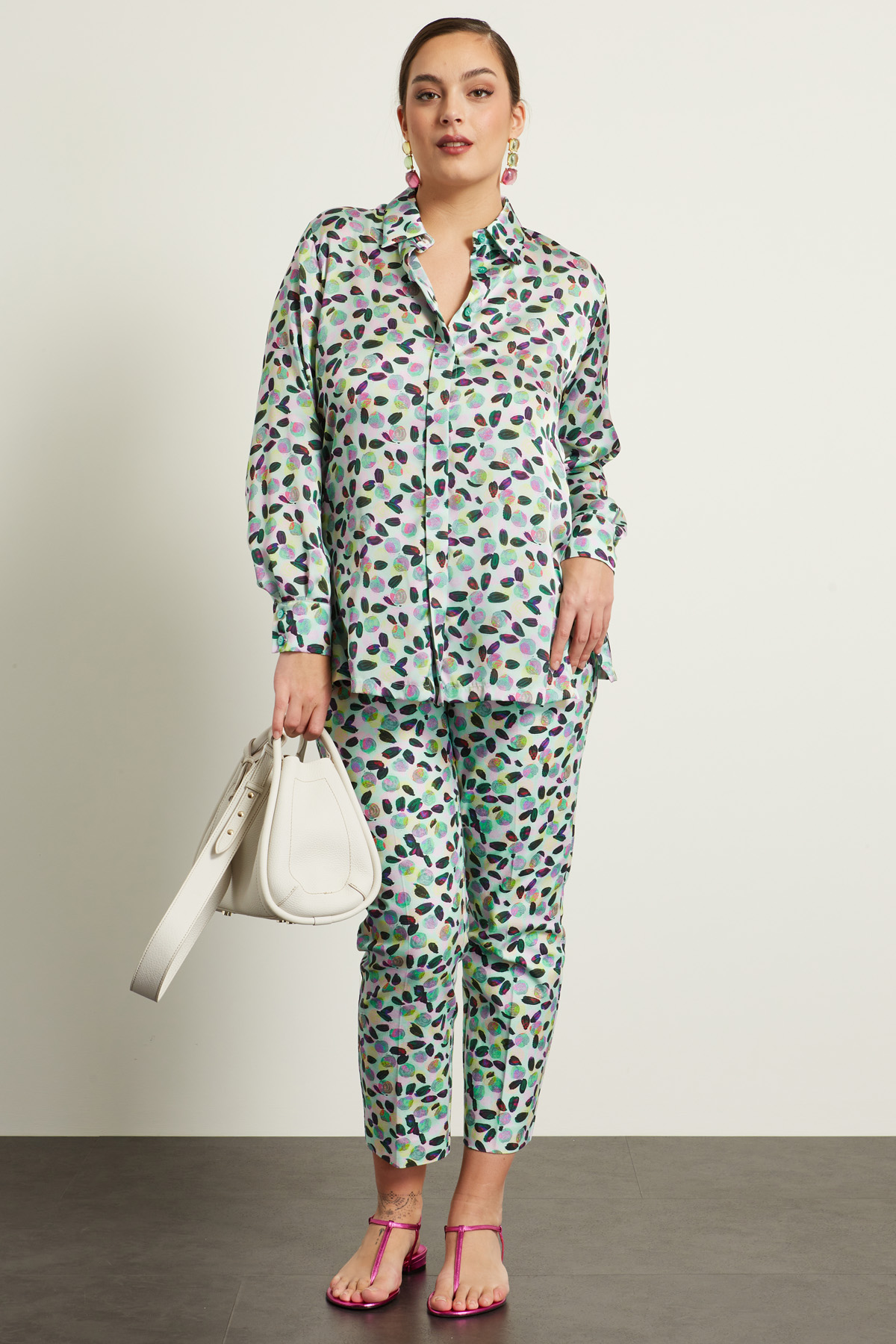 Camicia dalla linea fluida realizzata in raso stampato, con colletto classico, maniche lunghe con polsino e bottoni, spacchi laterali al fondo. Allacciatura nascosta tramite bottoni.