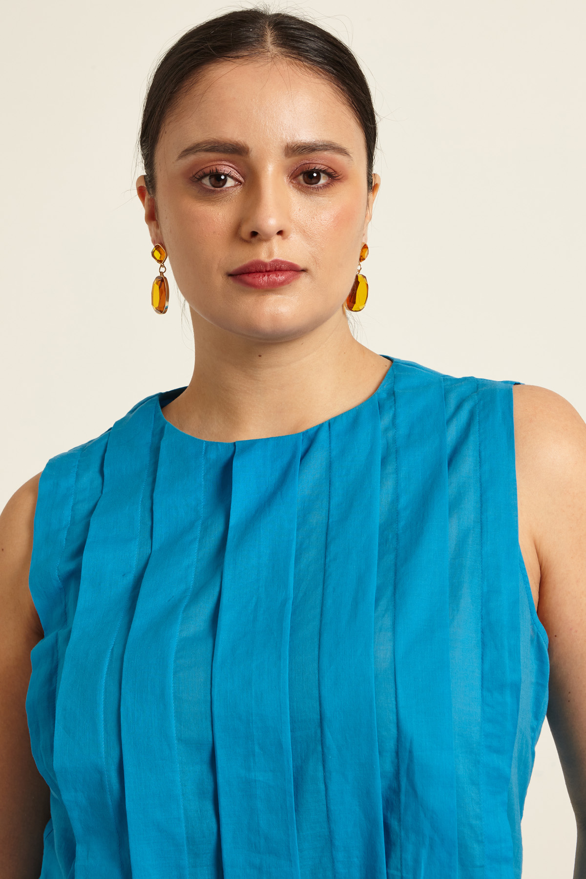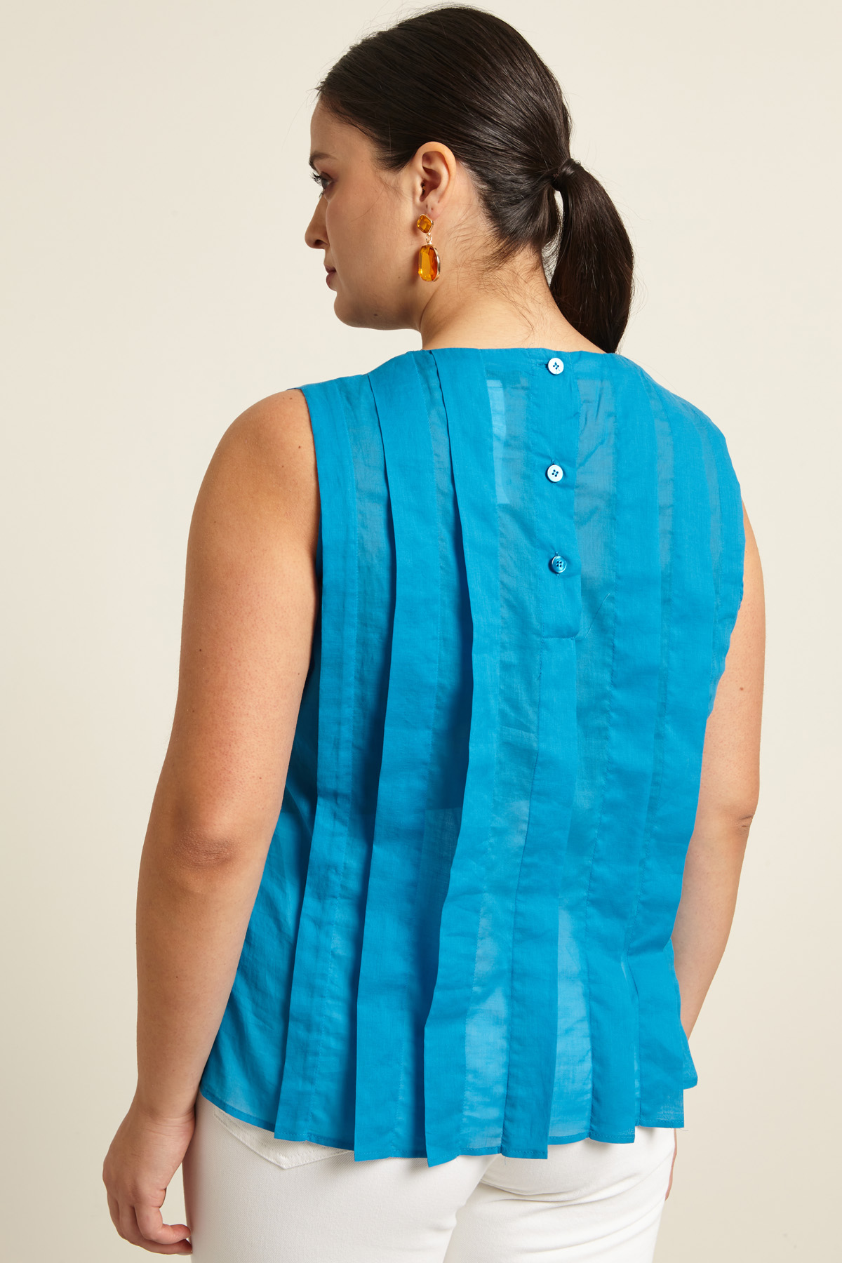 Blusa dalla linea dritta realizzata in voile di cotone con pieghe cucite davanti e dietro. Collo tondo e senza maniche. Allacciatura tramite bottoni nel retro.