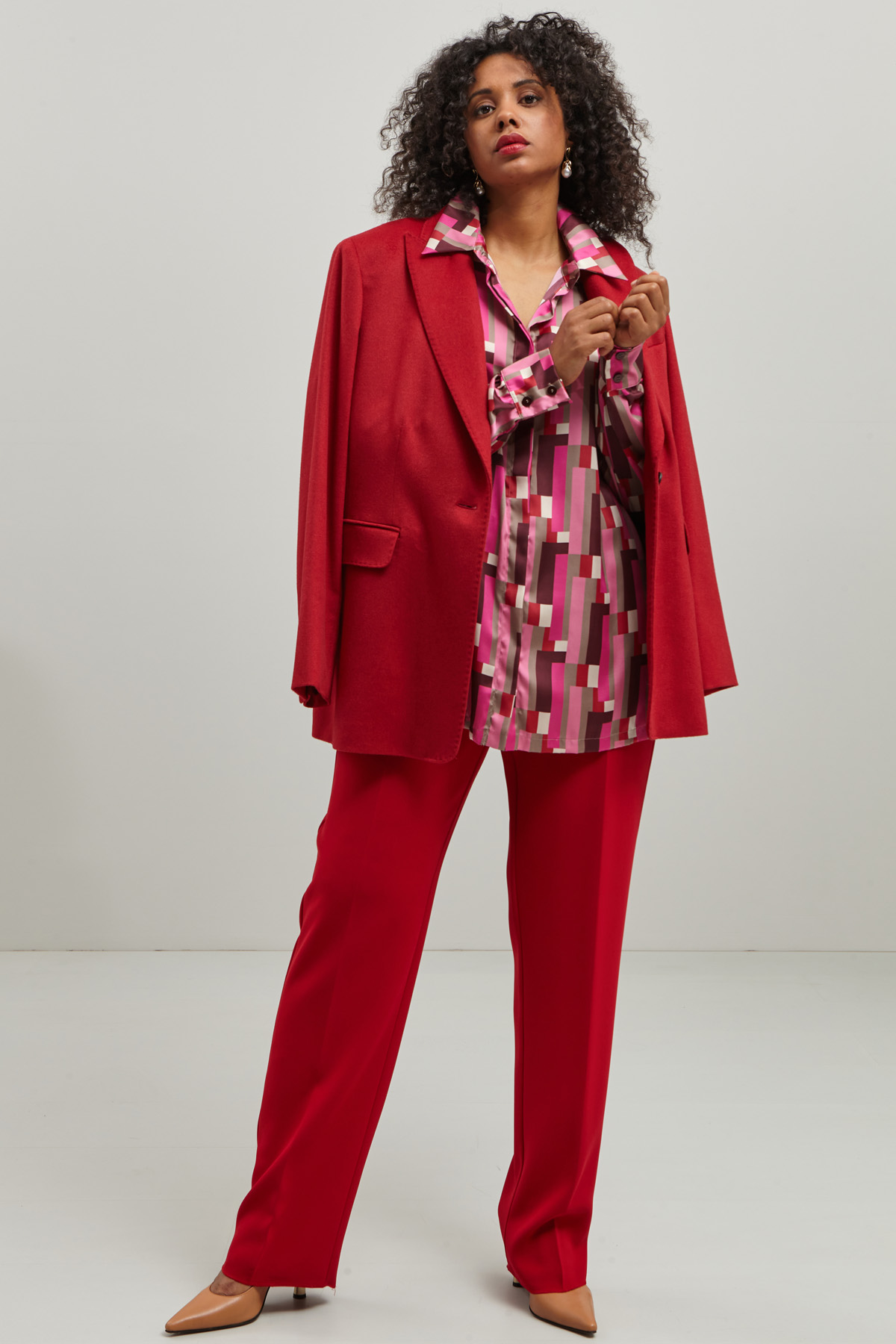 Camicia dalla linea dritta realizzata in raso stampato, con colletto classico, maniche lunghe con polsino e bottoni, spacchetti al fondo e allacciatura nascosta tramite bottoni.