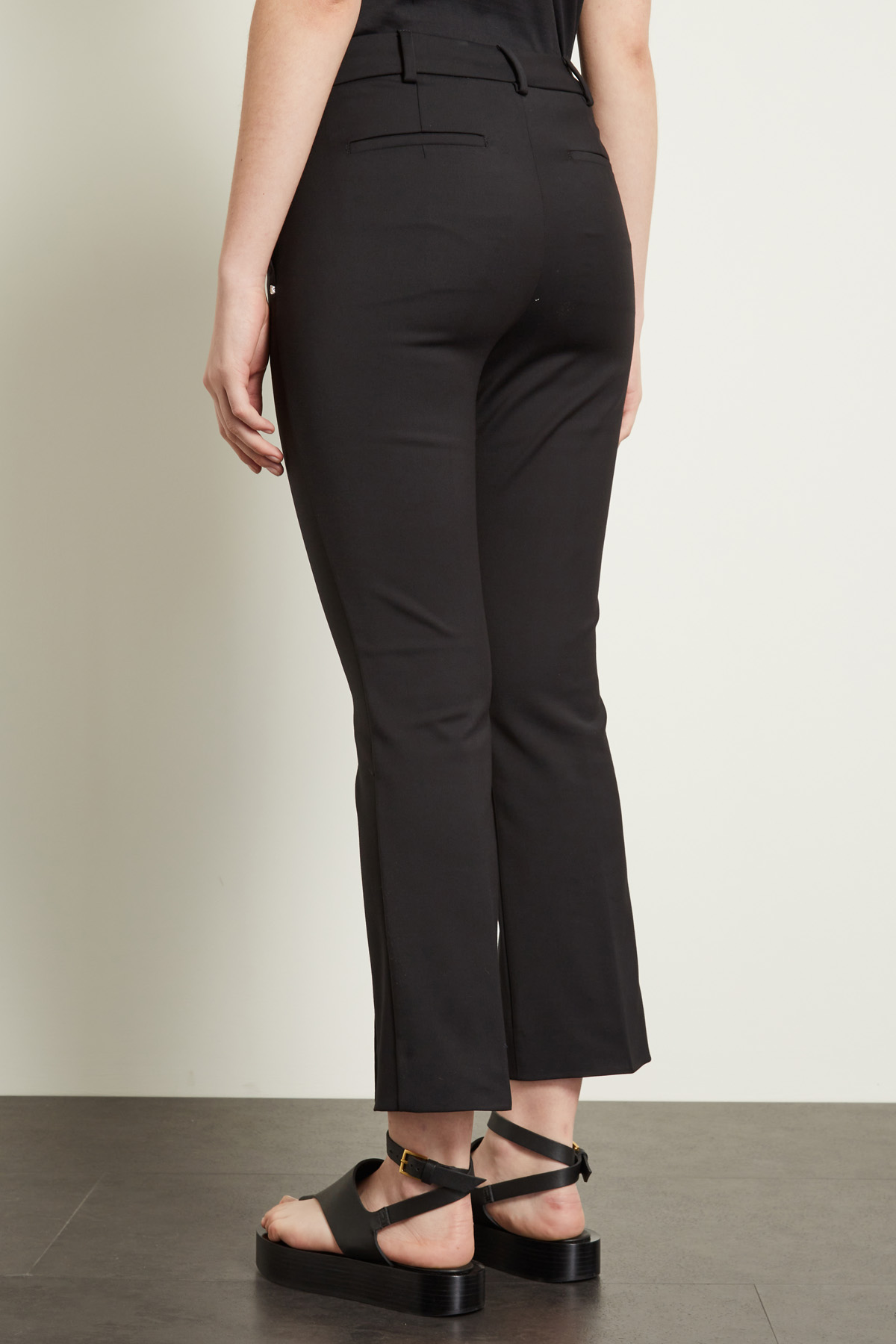 Pantalone in tela di misto cotone stretch, dalla linea mini flare, con nervature lungo la gamba e lunghezza cropped alla caviglia.
