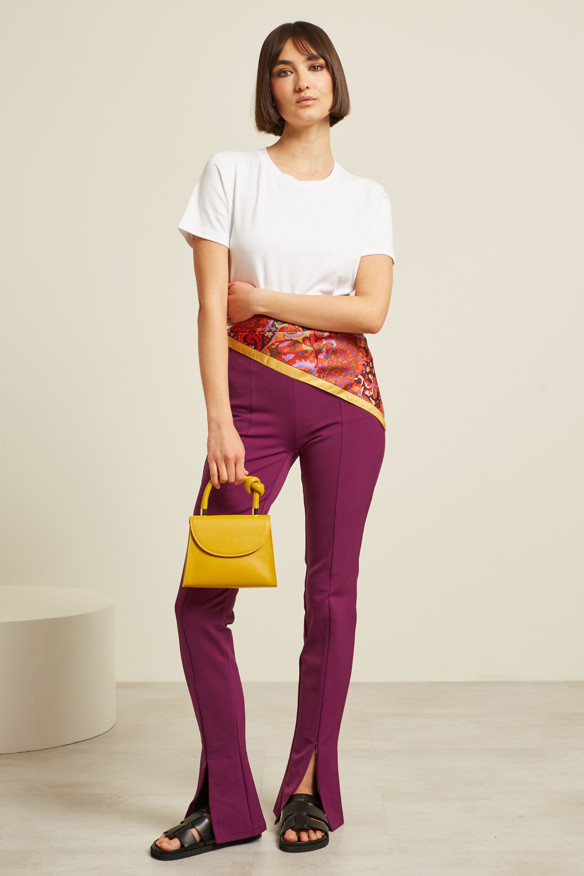 Pantaloni slim realizzati in jersey tecnico stretch, spacchi al fondo con zip e allacciatura tramite cerniera invisibile nel retro.