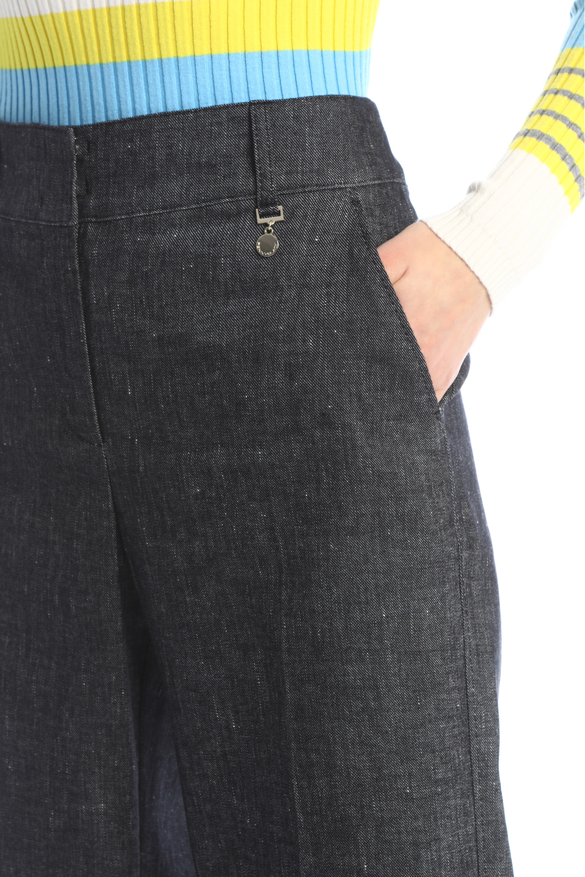 Pantaloni dalla linea a palazzo realizzati in drill stretch di lino e cotone dall'effetto denim, con passanti in vita, tasche laterali alla francese e a filetto dietro, piega stirata. Chiusura nascosta tramite zip, bottone e ganci.