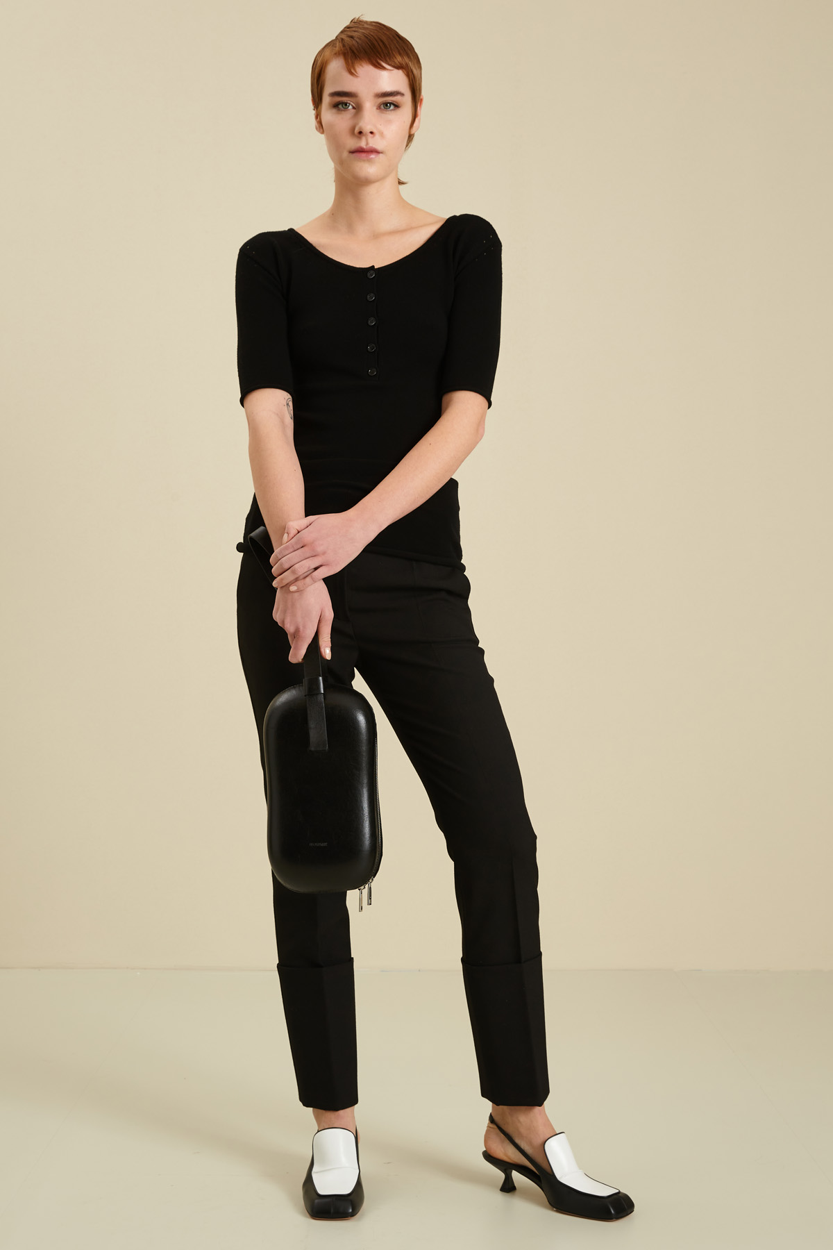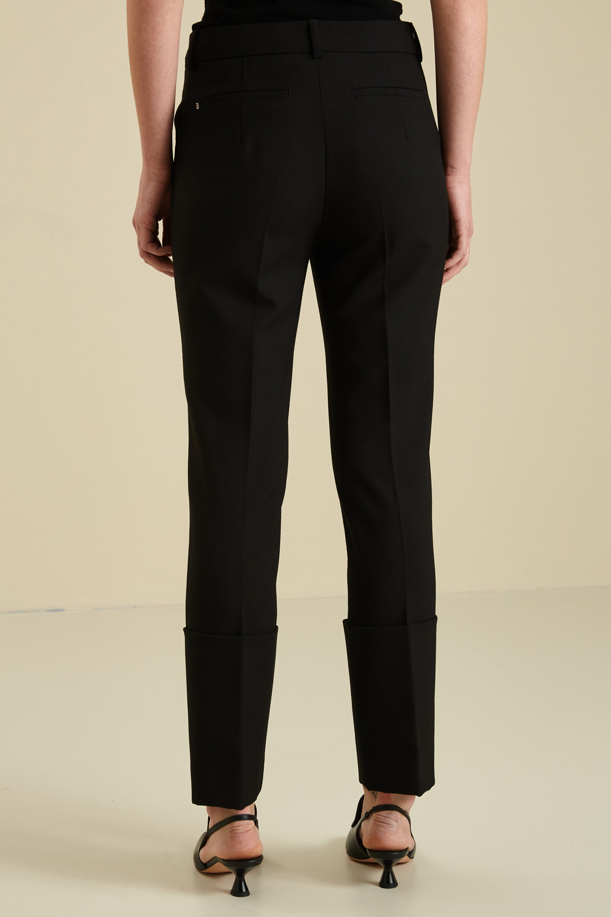 Pantaloni dalla linea dritta realizzati in pura lana, con cintone e passanti in vita, tasche alla francese ai fianchi e a filetto dietro, piega stirata, maxi risvolto al fondo e chiusura coperta tramite zip, gancio e bottone.