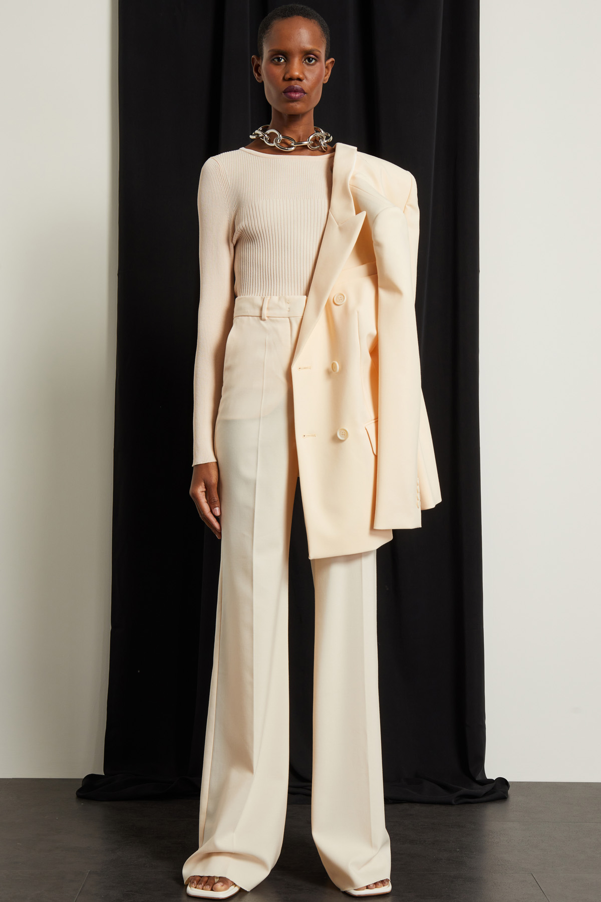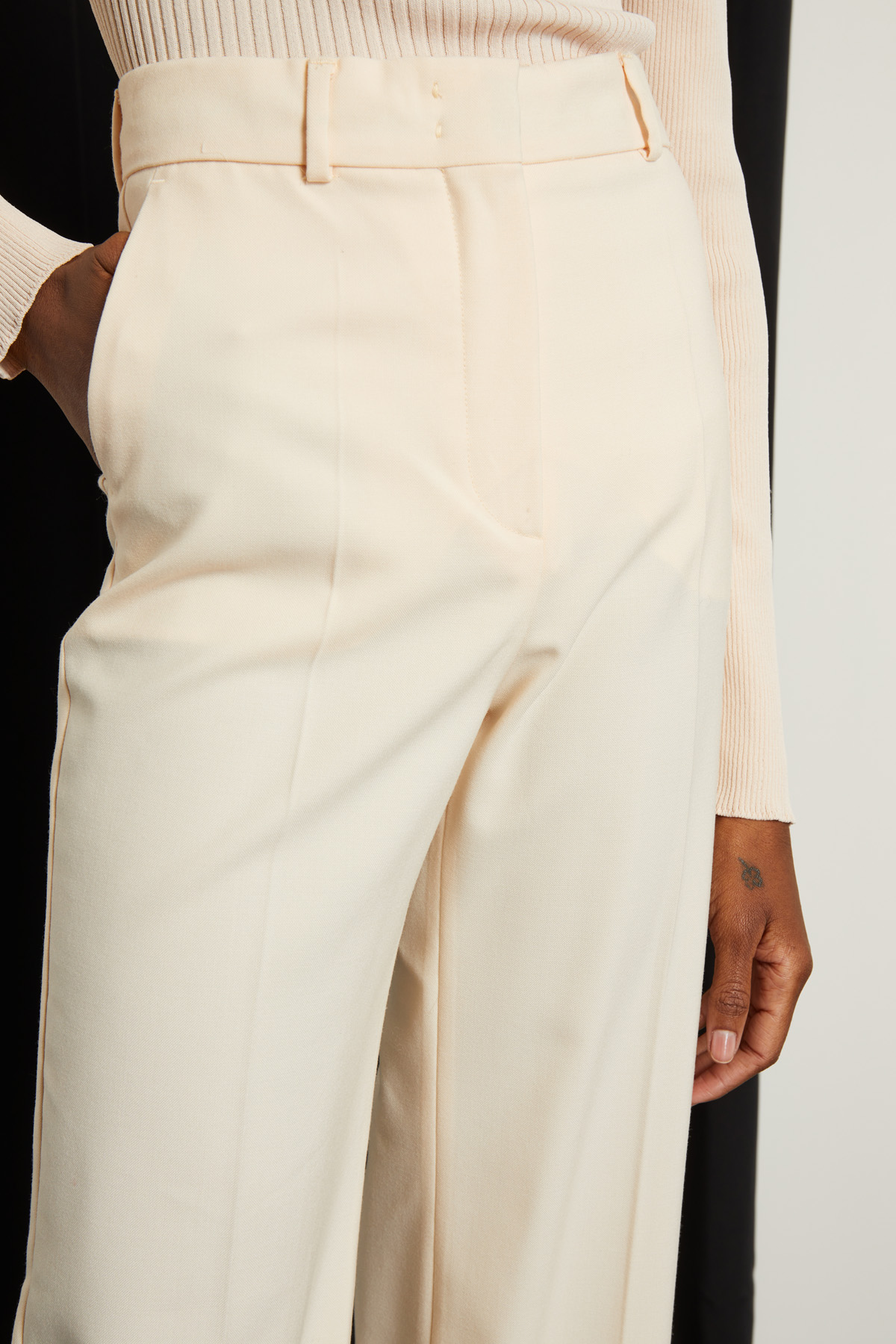 Pantaloni a palazzo realizzati in tela di pura lana, con passanti in vita, tasche alla francese sul davanti e filetto nel retro, piega stirata in lunghezza. Allacciatura nascosta tramite zip, bottone e gancio.