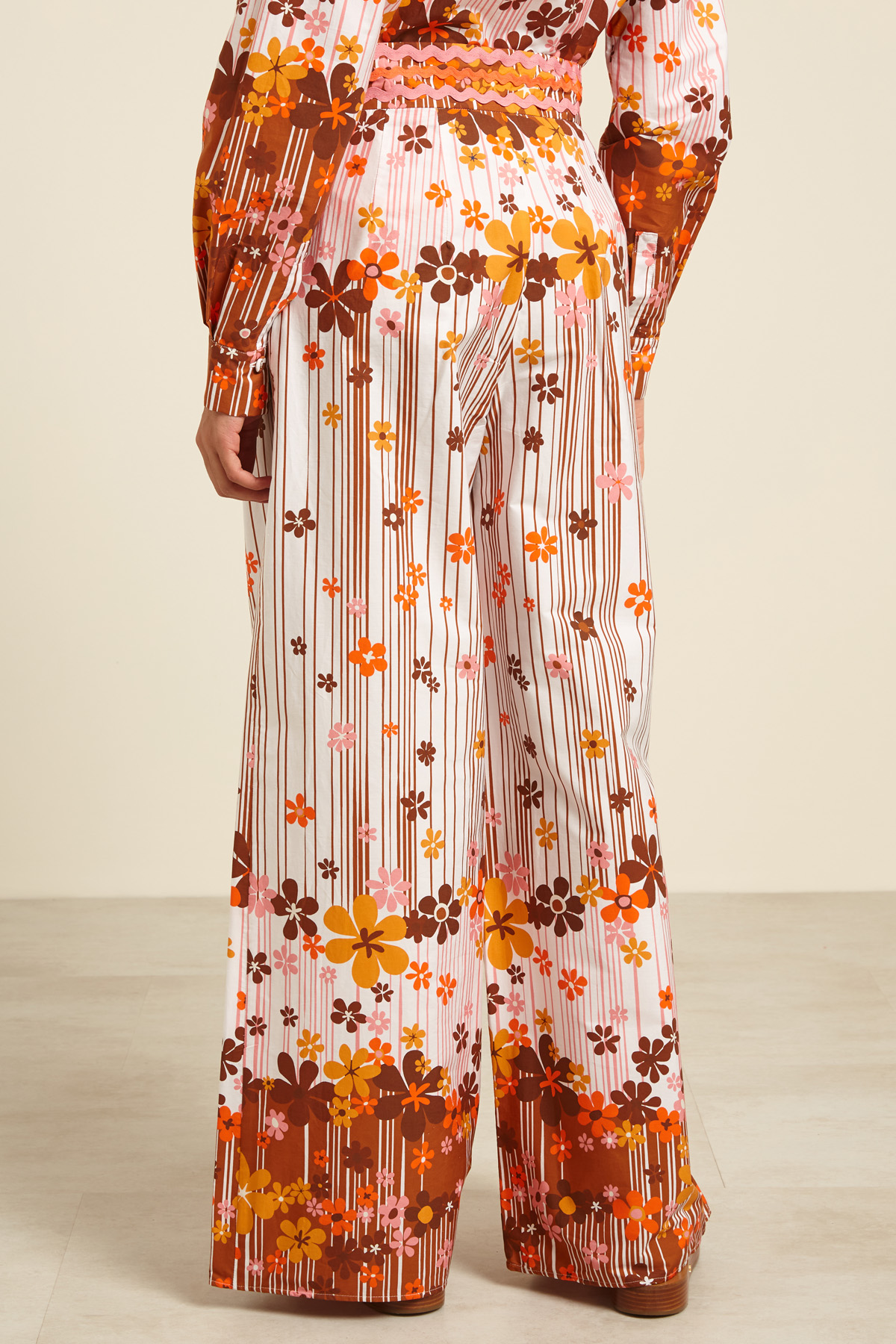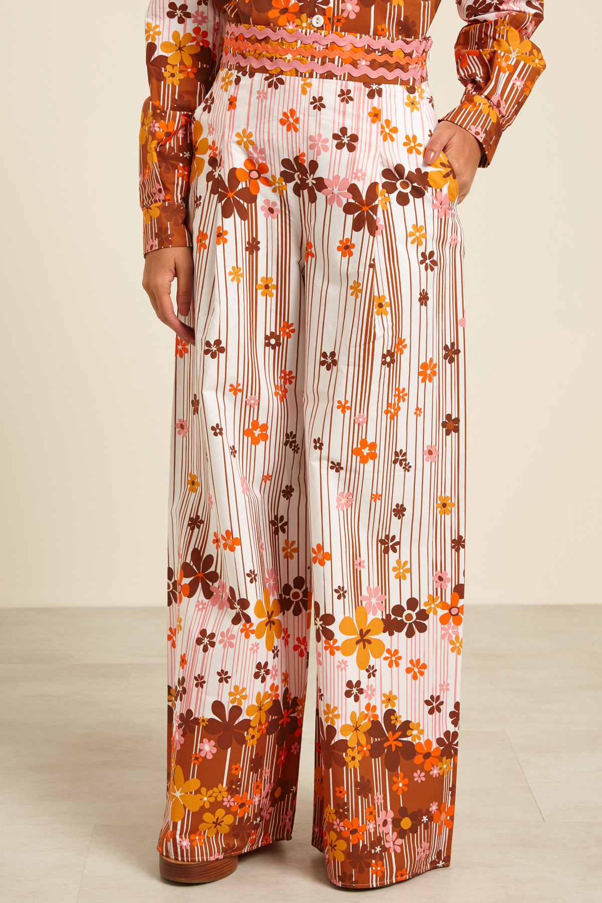 Pantaloni dalla linea ampia realizzati in popeline di puro cotone stampato, con cintone rifinito da passamaneria ondulata in vita, tasche laterali alla francese. Allacciatura tramite zip invisibile sul fianco.