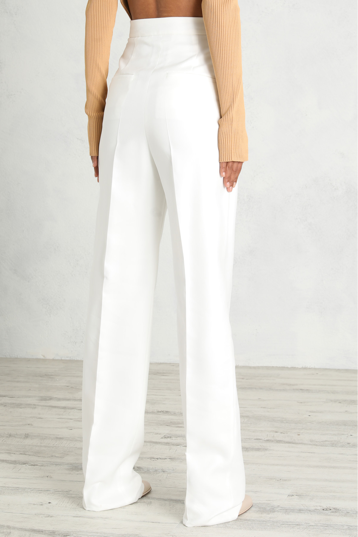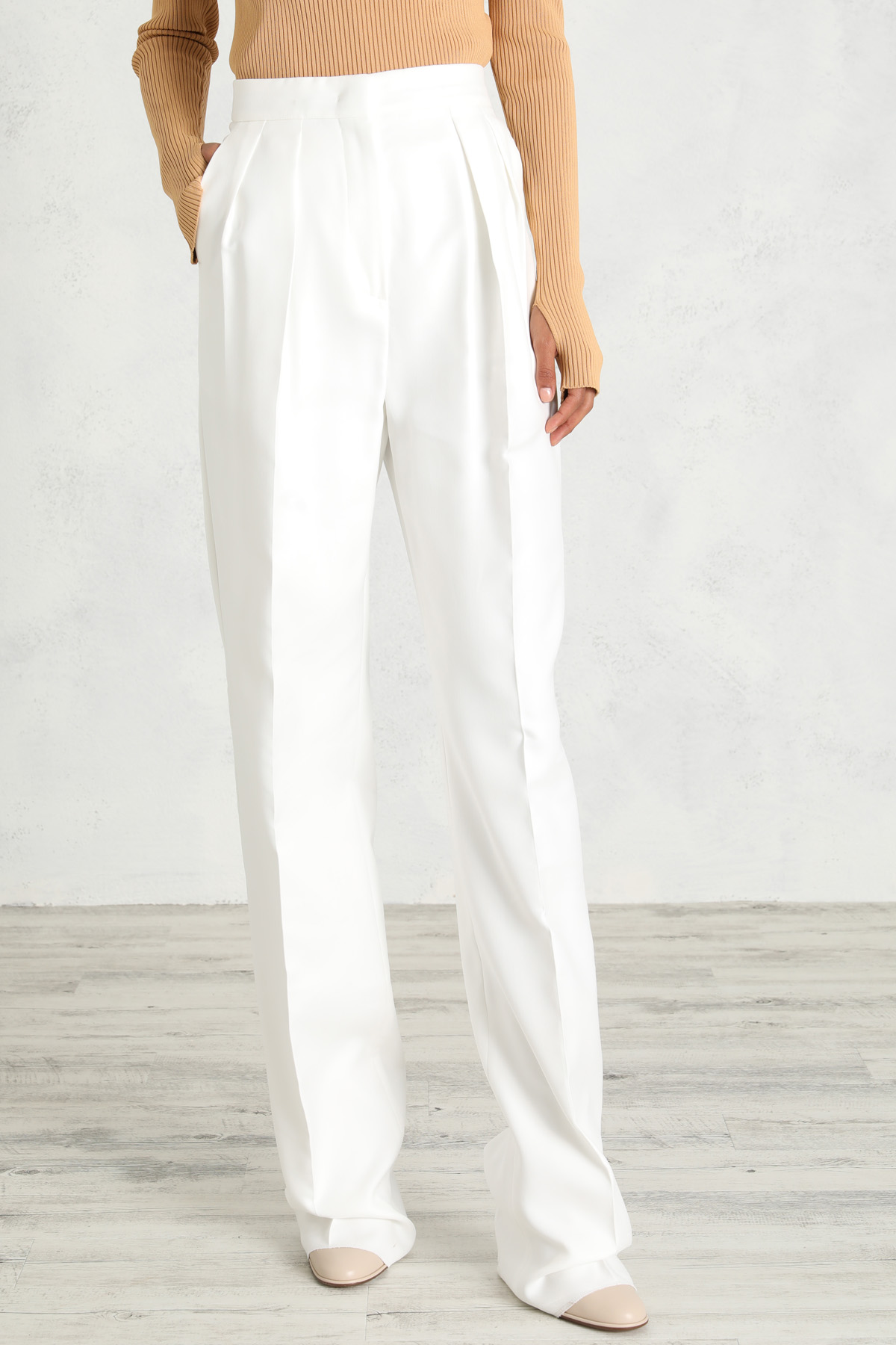 Pantalone dalla linea morbida realizzato in doppia batavia di cotone e viscosa, con pieghe in vita, tasche laterali alla francese e a filetto dietro. Allacciatura nascosta tramite zip, bottone e gancio.