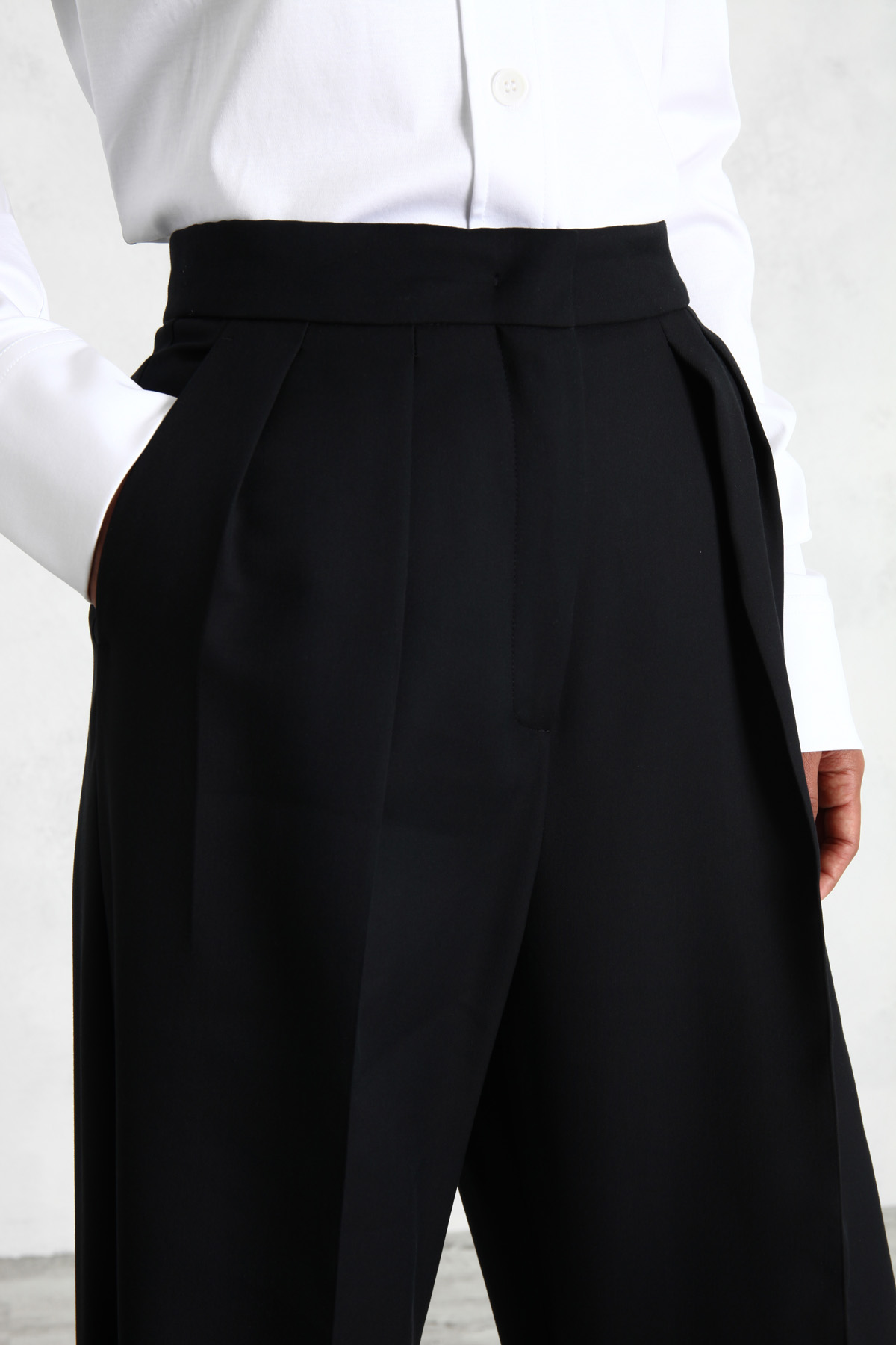 Pantalone dalla linea morbida realizzato in doppia batavia di cotone e viscosa, con pieghe in vita, tasche laterali alla francese e a filetto dietro. Allacciatura nascosta tramite zip, bottone e gancio.