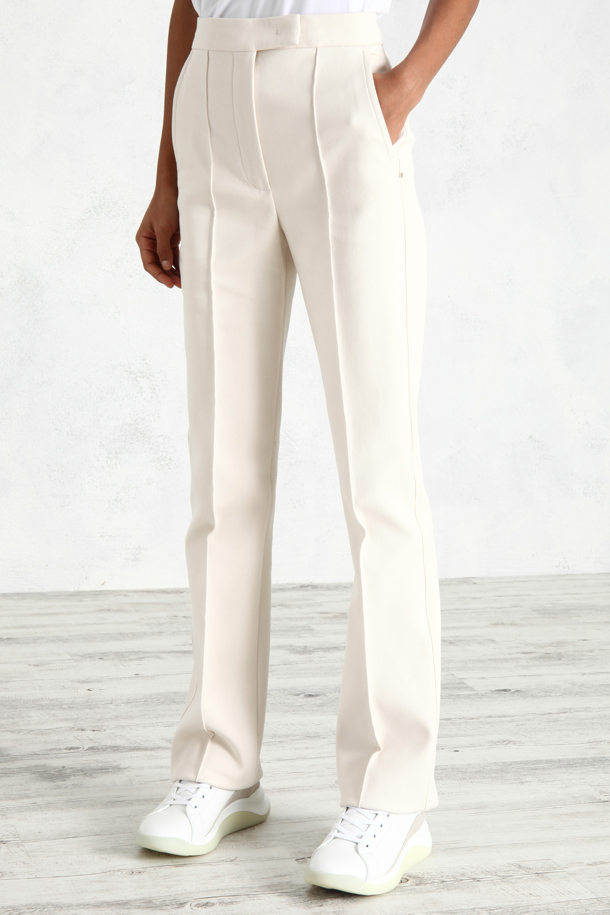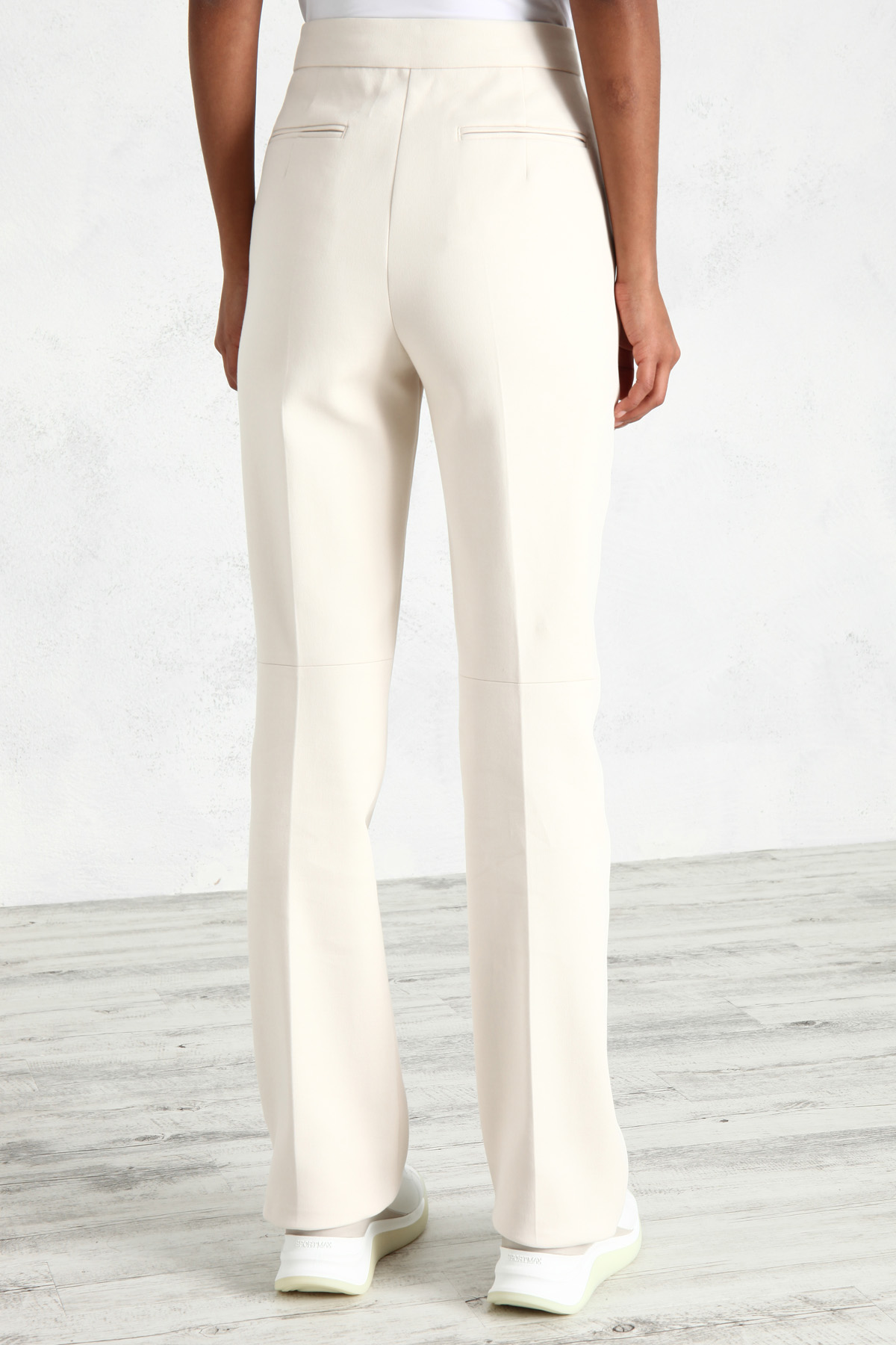 Pantalone dalla linea leggermente flare realizzato in doppia batavia di cotone stretch, con tasche alla francese sui fianchi e a doppio filetto sul retro, piega cucitura davanti. Allacciatura nascosta tramite zip, bottone e gancio.