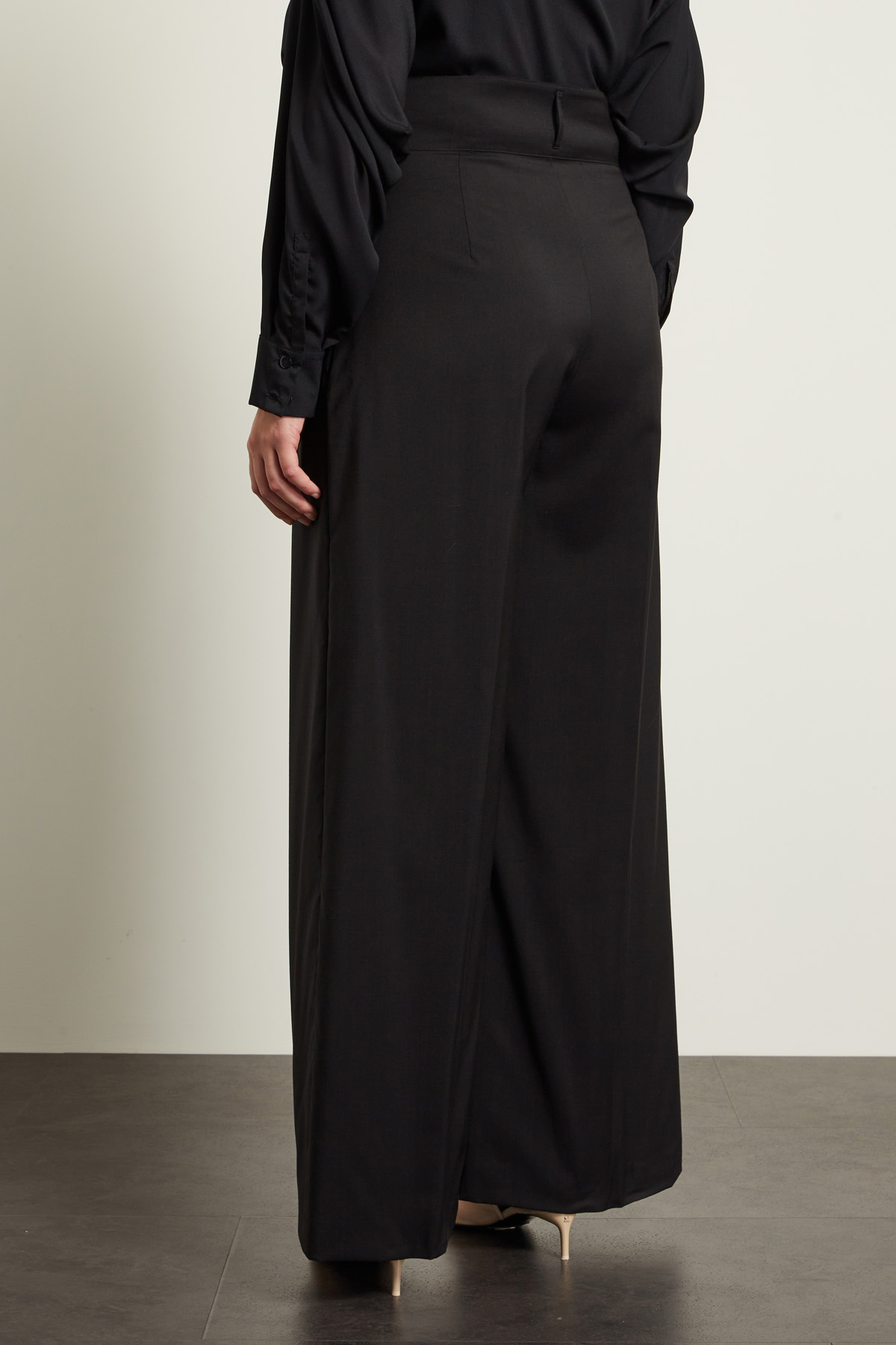 Pantaloni a palazzo realizzati in tela di pura lana, con passanti in vita, pinces, tasche alla francese e piega stirata in lunghezza. Allacciatura nascosta tramite zip.