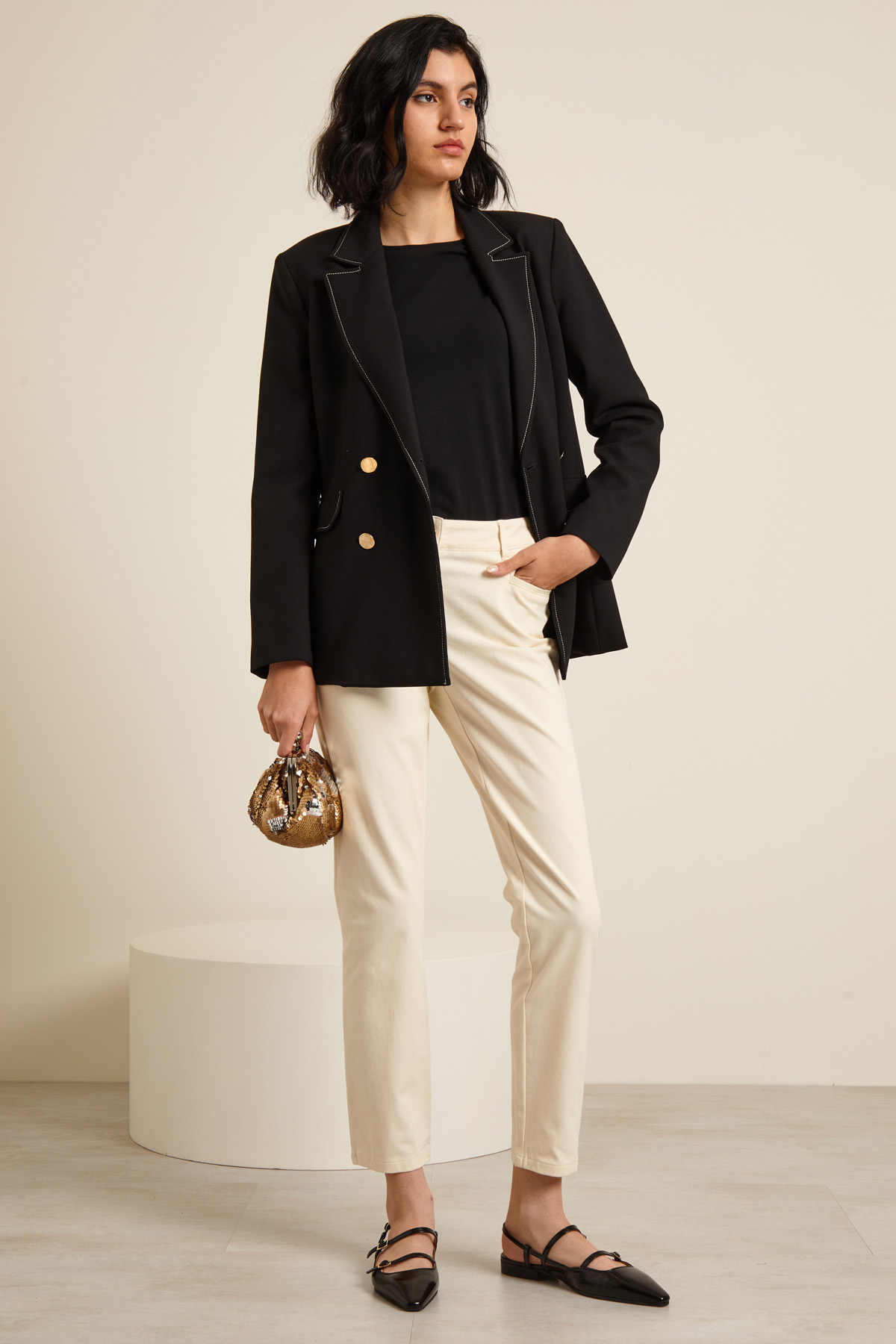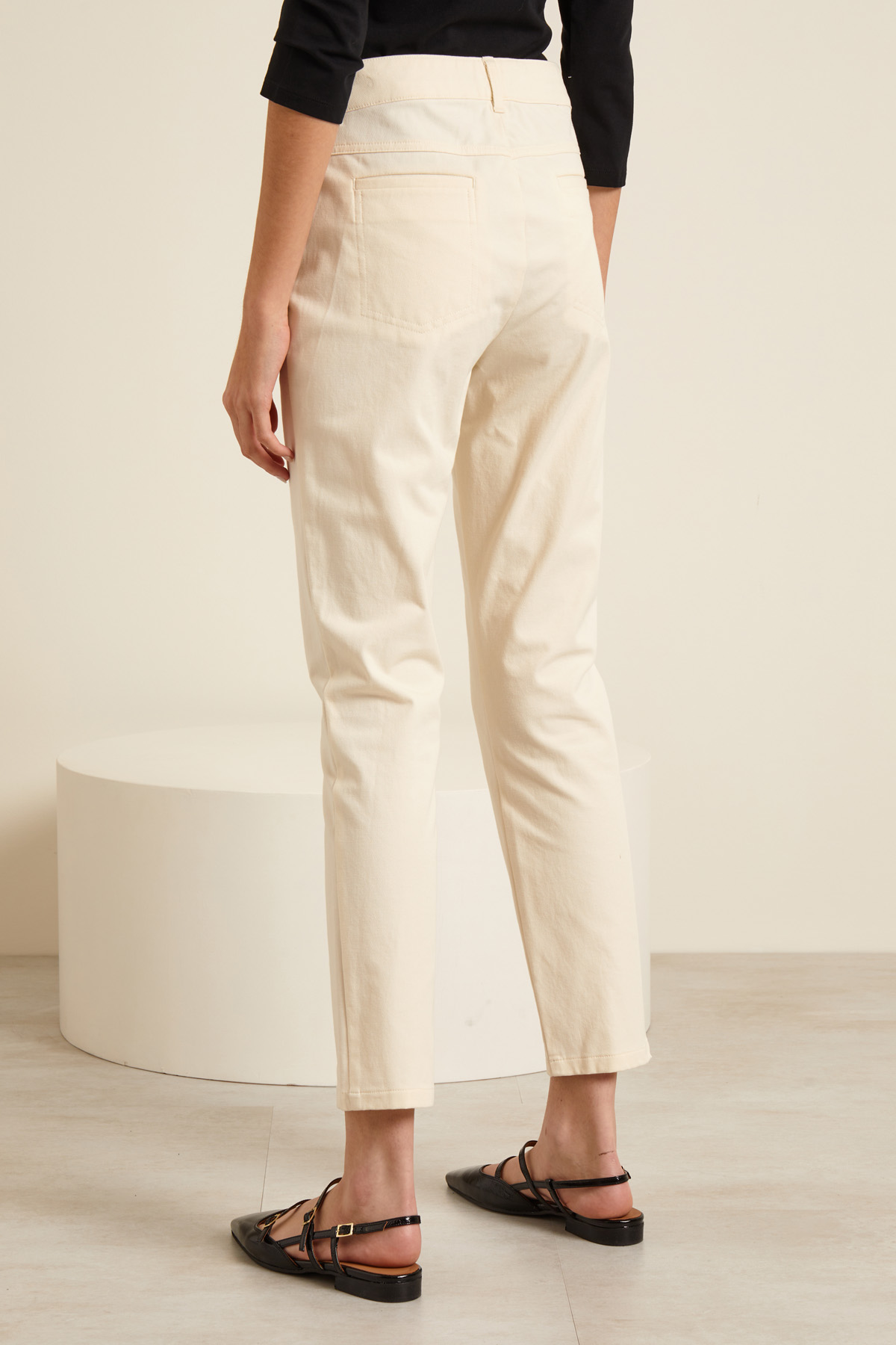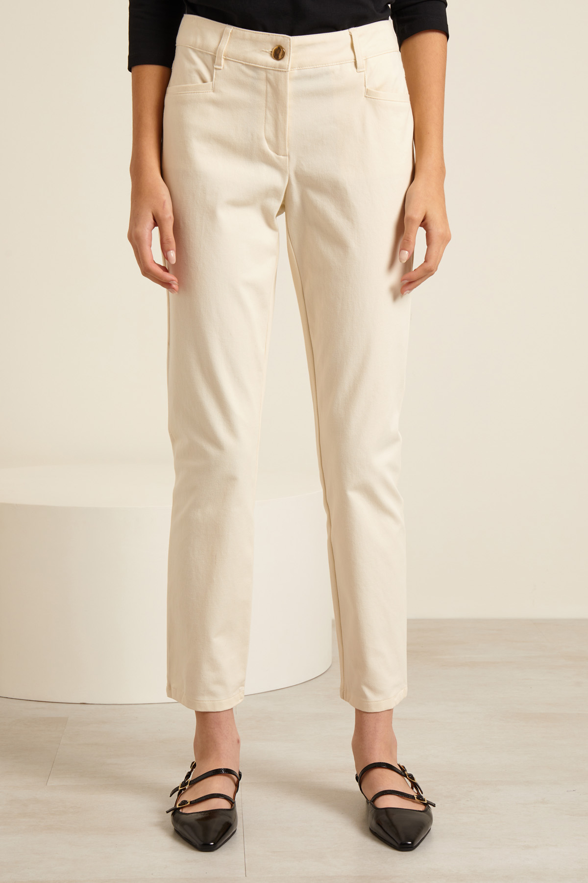 Pantaloni skinny realizzati in gabardina di cotone stretch, con passanti in vita, tasche alla francese davanti e a filetto dietro. Allacciatura tramite zip nascosta e bottone in metallo.