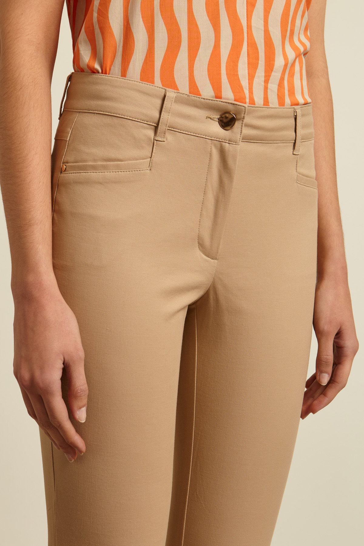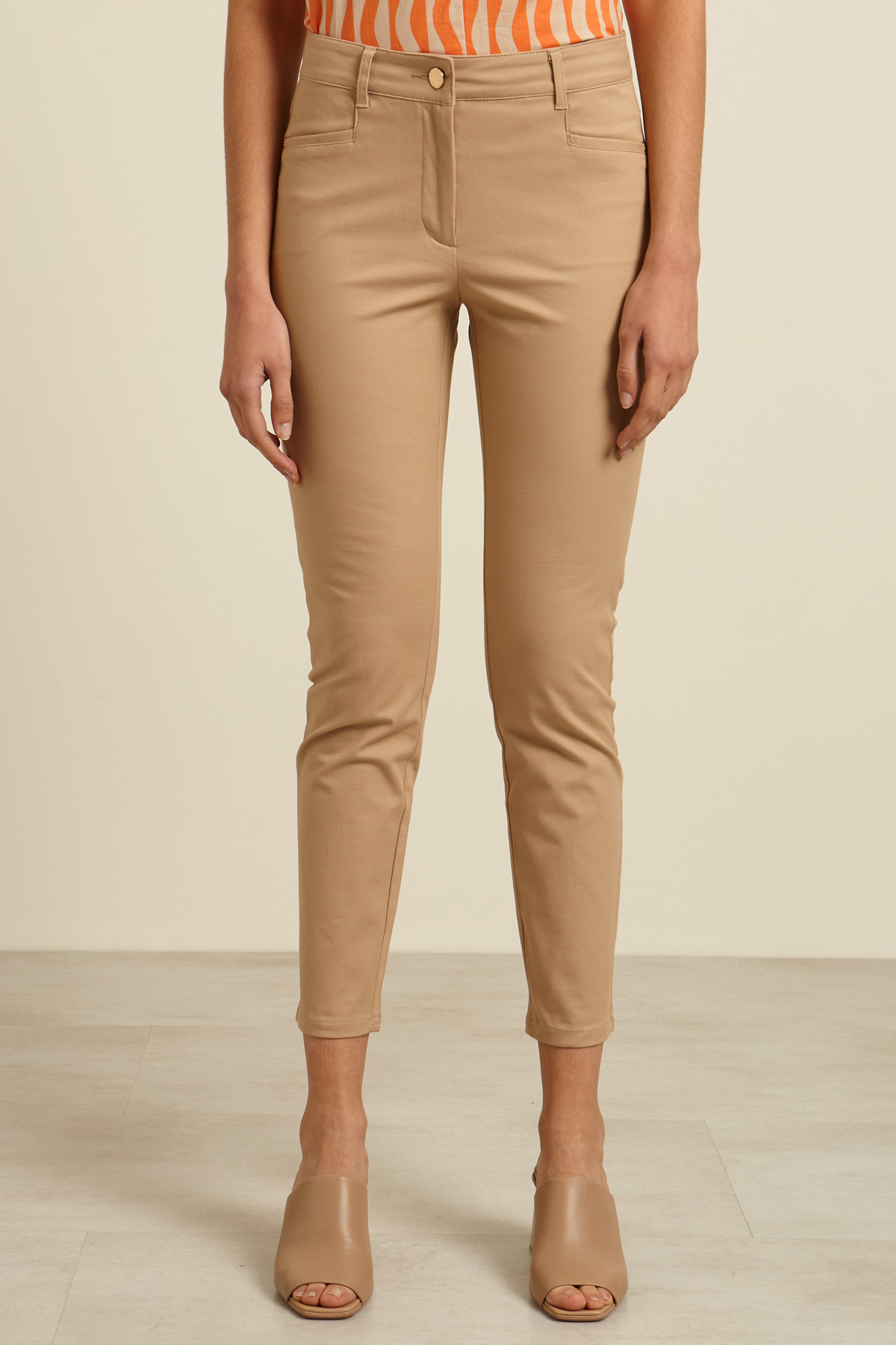Pantaloni skinny realizzati in gabardina di cotone stretch, con passanti in vita, tasche alla francese davanti e a filetto dietro. Allacciatura tramite zip nascosta e bottone in metallo.