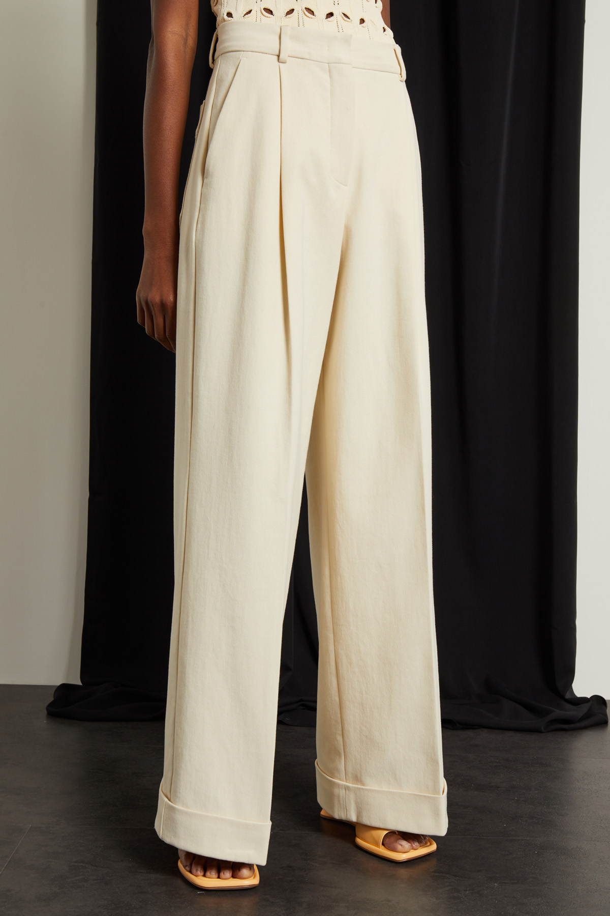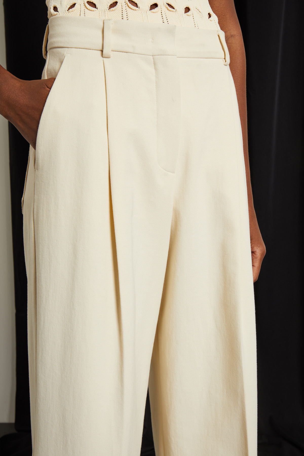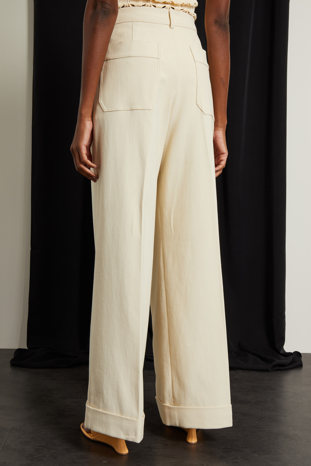 Pantaloni a zampa realizzati in tessuto crépe di puro cotone, con passanti e pieghe cucite in vita, tasche alla francese davanti e applicate dietro, risvolti a fondo capo. Allacciatura nascosta tramite zip, bottone e gancio.