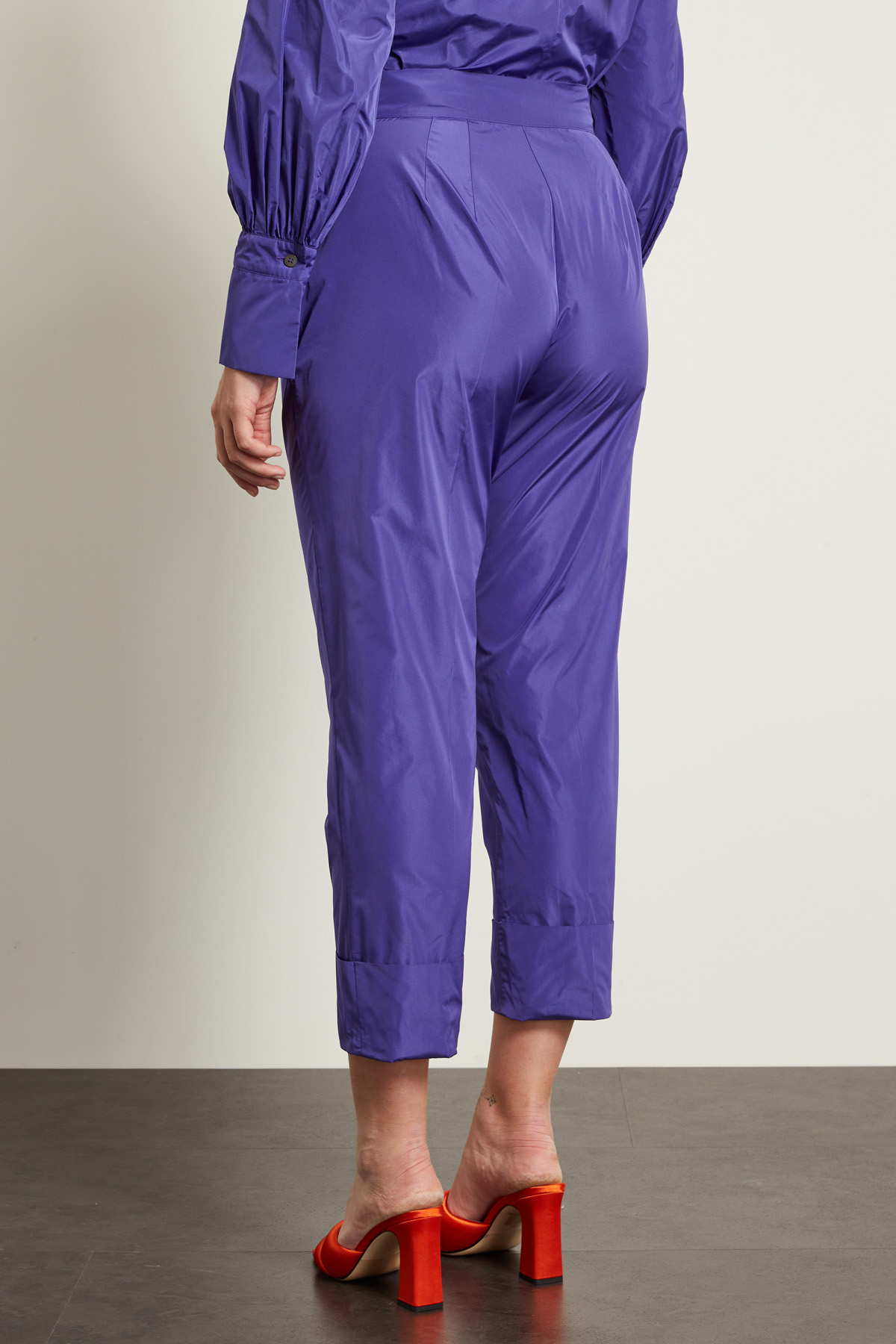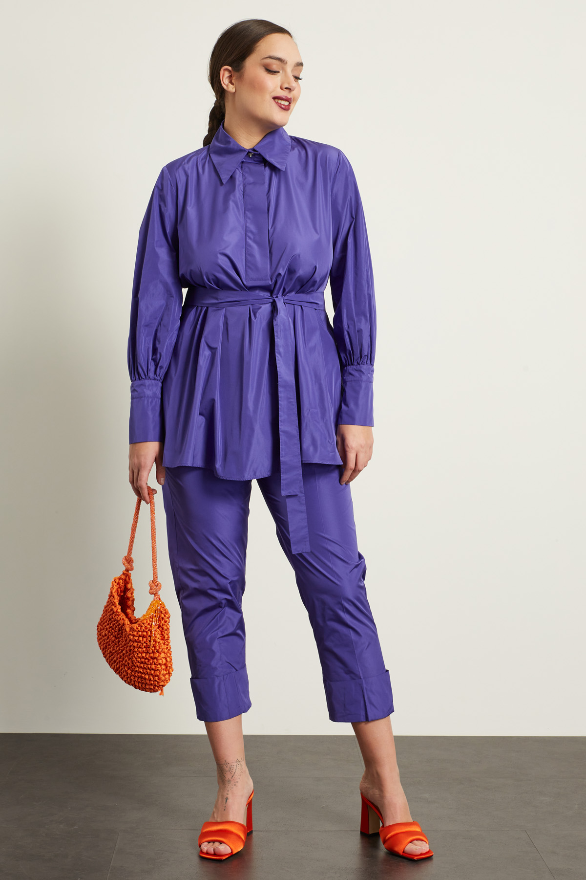Pantaloni dalla linea dritta realizzati in taffetà con cintone in vita, tasche alla francese sul davanti, piega stirata in lunghezza e risvolto a fondo capo. Allacciatura nascosta tramite zip e gancio.