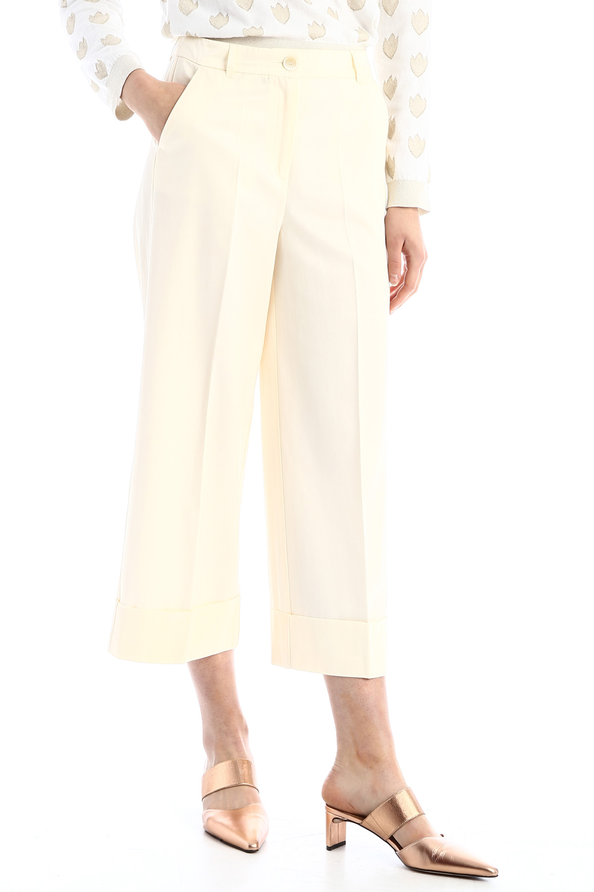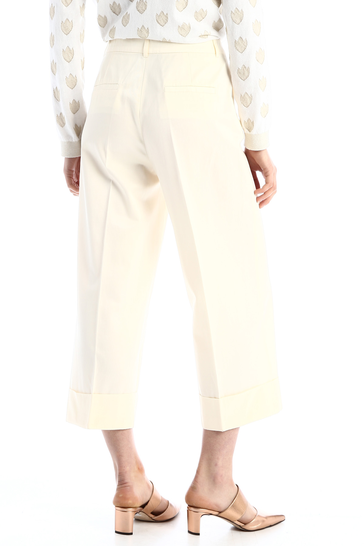 Pantaloni cropped dalla linea ampia realizzati in tessuto diagonale di viscosa e cotone, con tasche laterali alla francese e a filetto dietro. Allacciatura con zip nascosta e bottone.