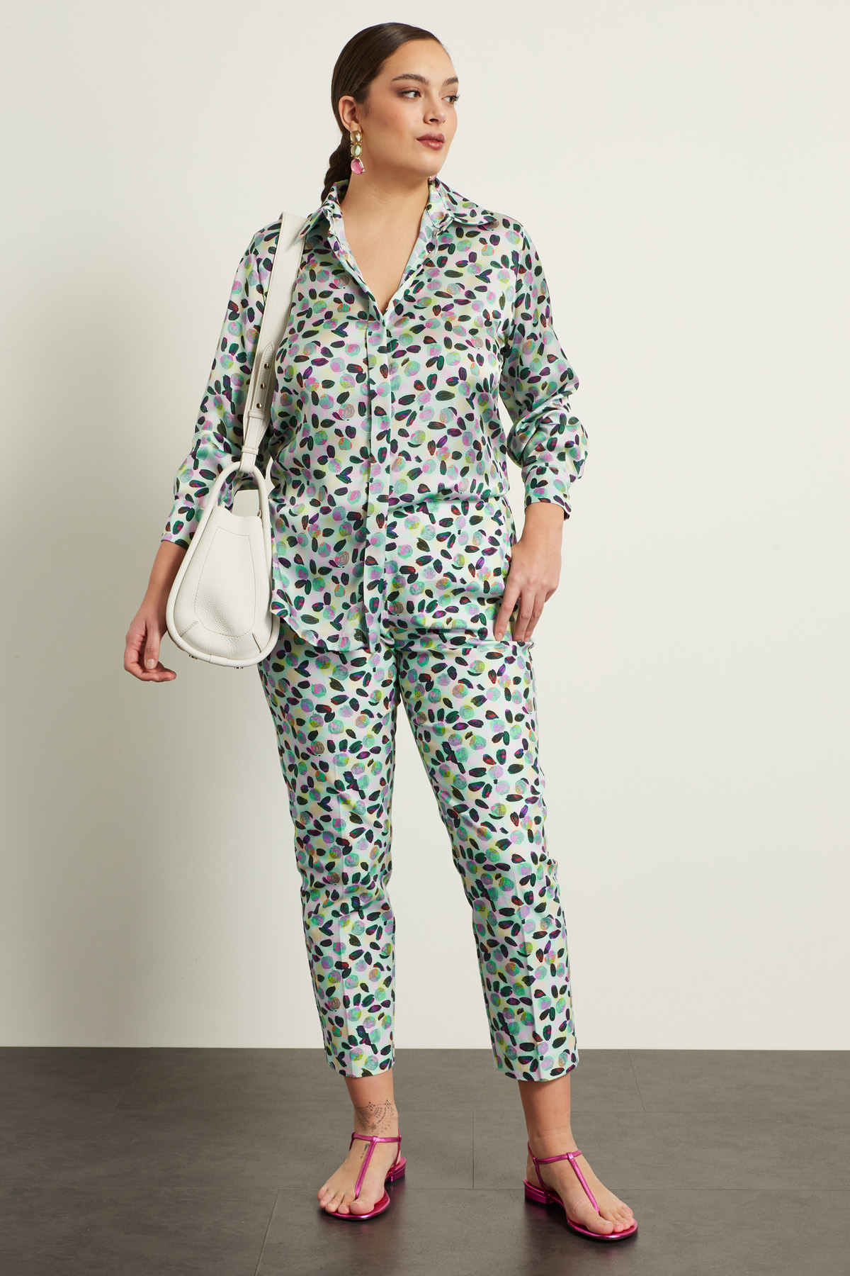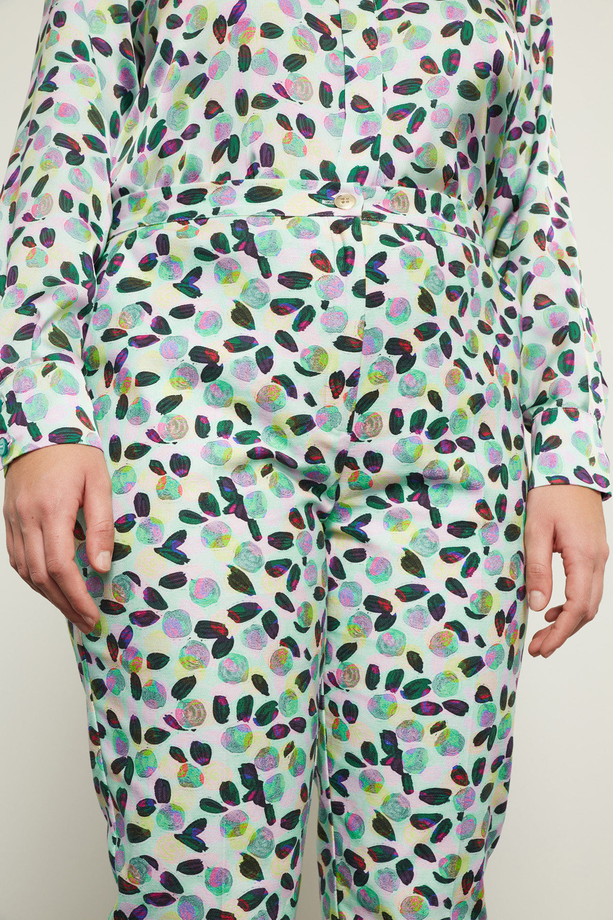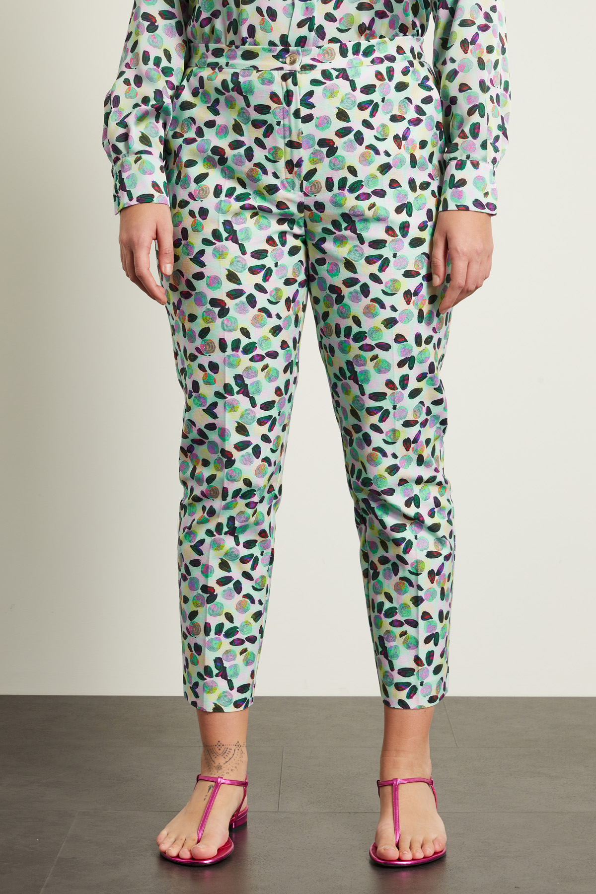 Pantaloni a sigaretta realizzati in bull di cotone stretch stampato, con cintone in vita e tasche alla francese, piega stirata in lunghezza. allacciatura tramite zip e bottone.