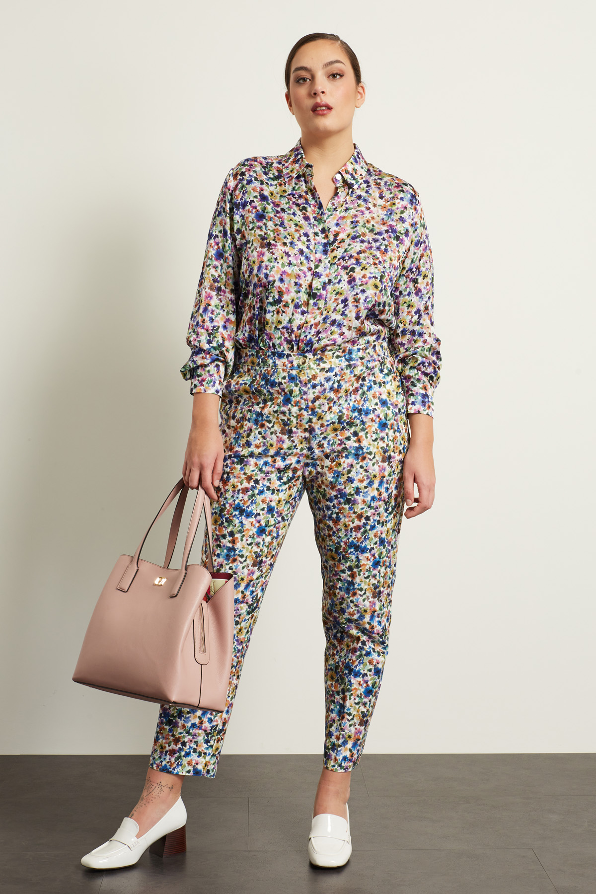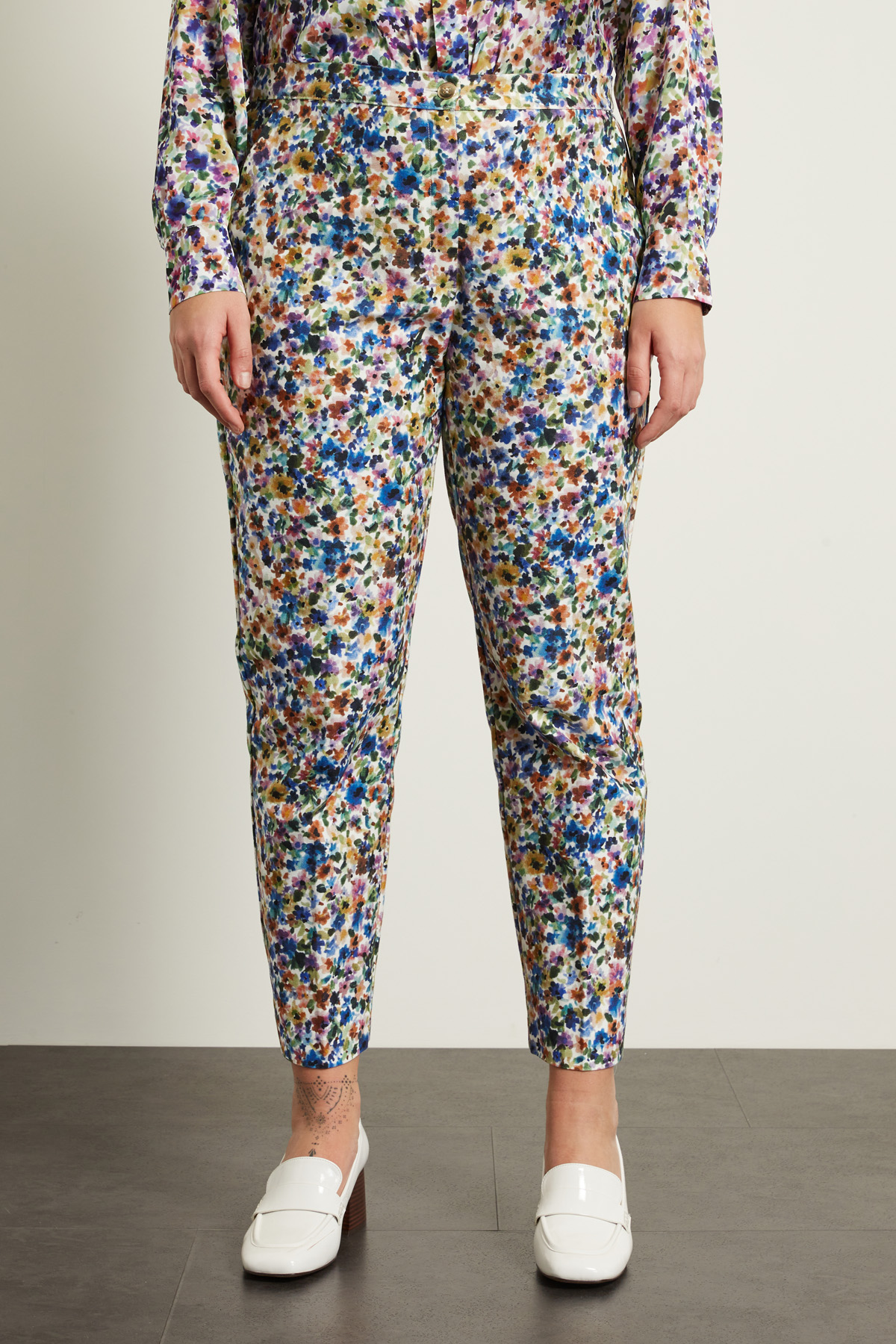 Pantaloni a sigaretta realizzati in bull di cotone stretch stampato, con cintone in vita e tasche alla francese, piega stirata in lunghezza. allacciatura tramite zip e bottone.