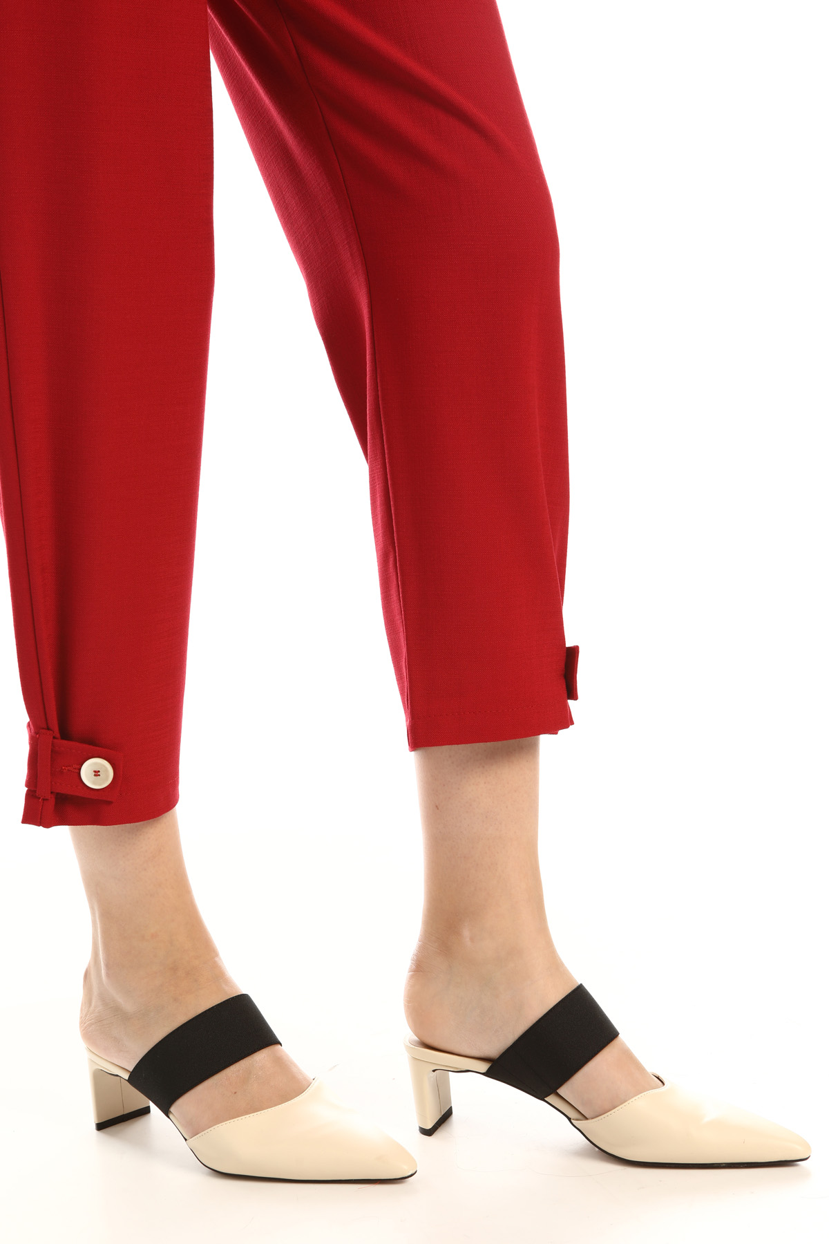 Pantaloni baggy realizzati in stuoia di misto viscosa, con pieghe in vita, tasche laterali alla francese e a filetto nel retro, alamari con bottone su fondo. Allacciatura tramite zip nascosta e bottone.