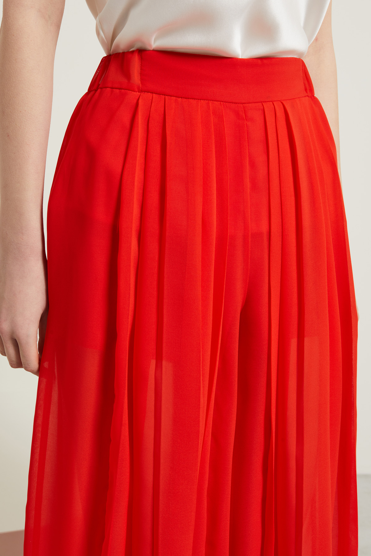 Pantaloni dalla linea fluida realizzati in chiffon con lavorazione plissè, inserto elastico e pieghe cucite in vita. Semifoderati.