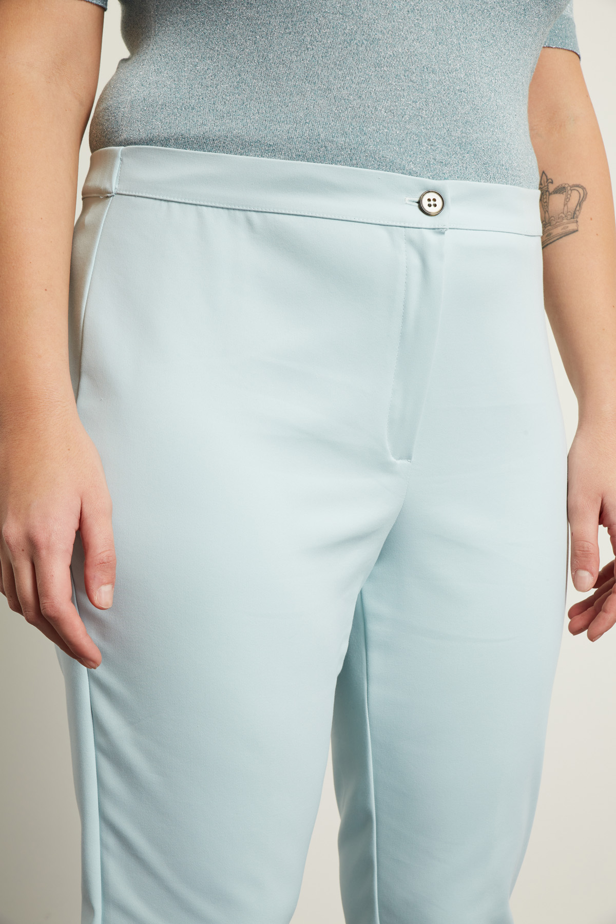 Pantaloni slim realizzati in misto cotone stretch, con inserto elastico in vita e allacciatura tramite zip e bottone.