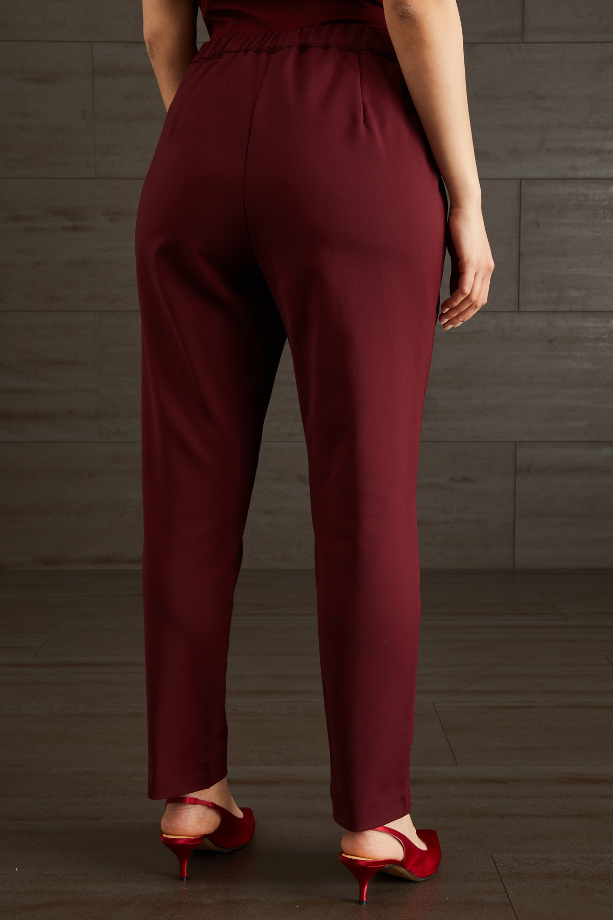 Pantaloni a sigaretta realizzati in tessuto di misto cotone stretch, con inserto elastico in vita, allacciatura tramite zip nascosta e bottone.