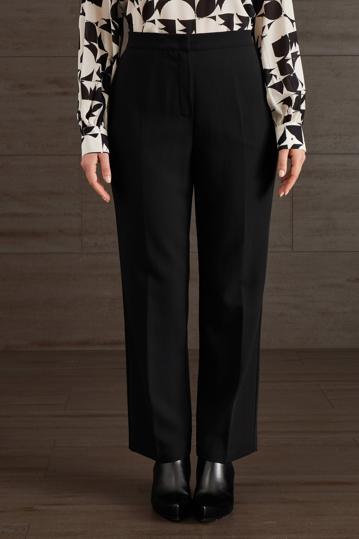 Pantaloni dalla linea dritta realizzati in crépe di pura lana, con tasche alla francese, piega stirata, allacciatura nascosta tramite zip, bottone e gancio.