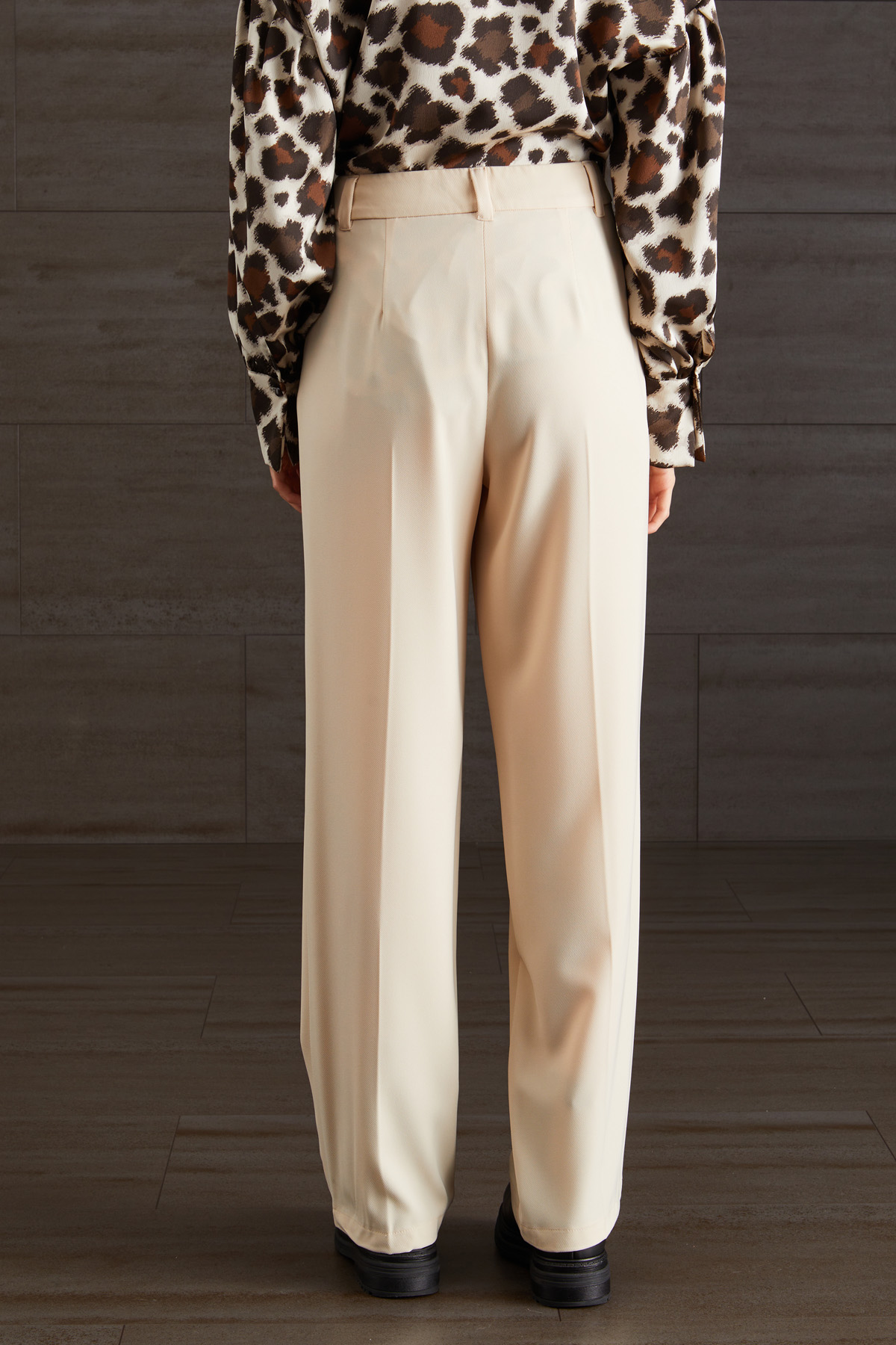 Pantaloni dalla linea dritta realizzati in tessuto diagonale stretch con passanti in vita,tasche alla francese e piega stirata. Allacciatura nascosta tramite ganci zip e bottone.