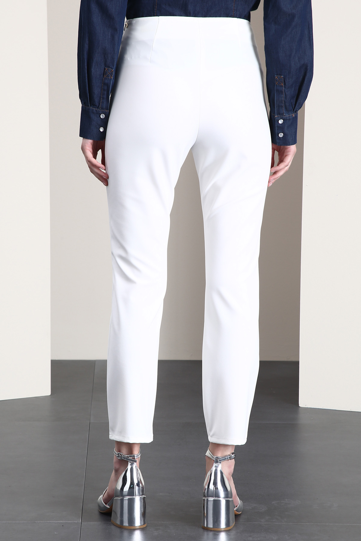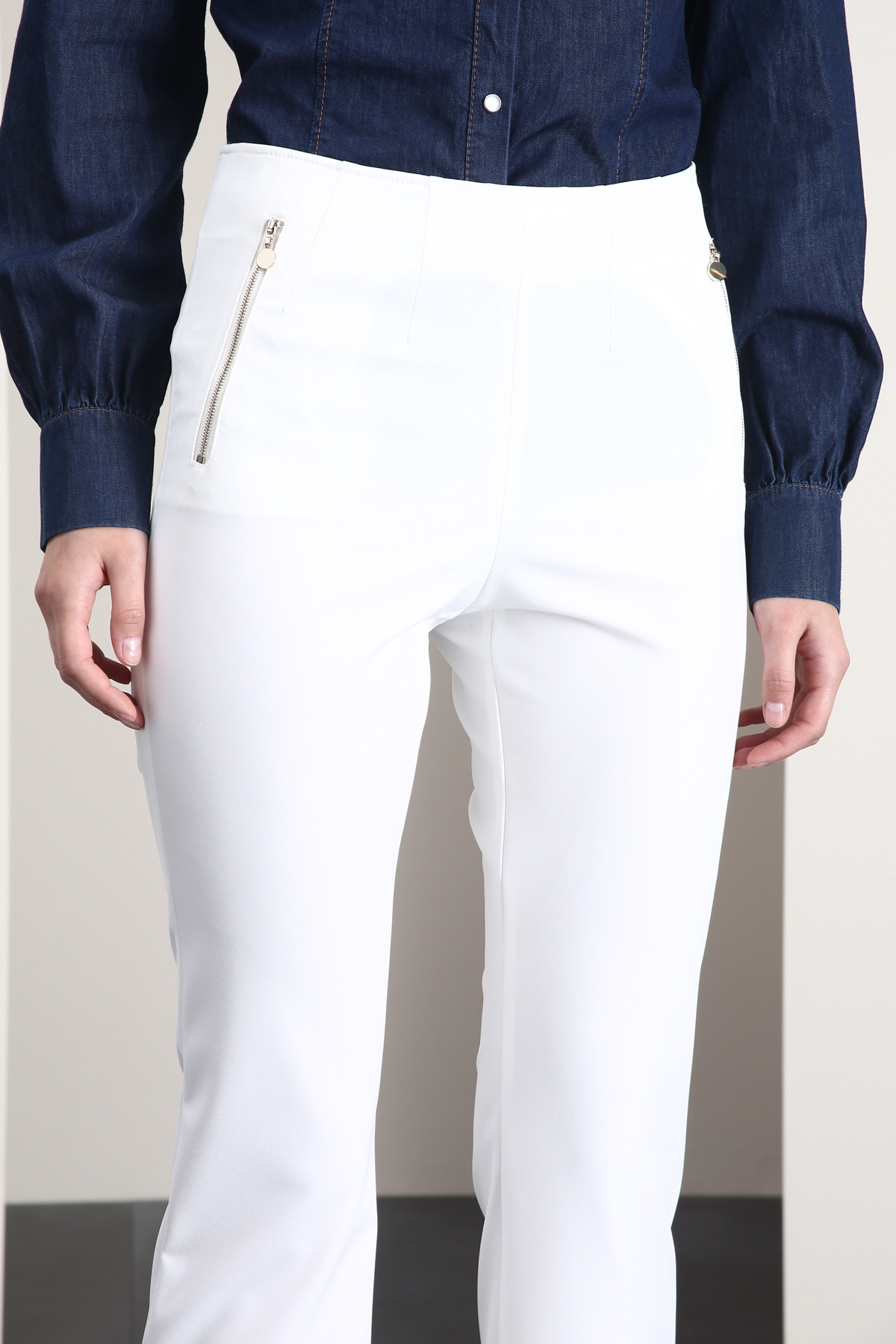 Pantaloni dalla linea dritta realizzati in tessuto tecnico stretch, tasche laterali con zip e allacciatura tramite zip invisibile sul fianco.