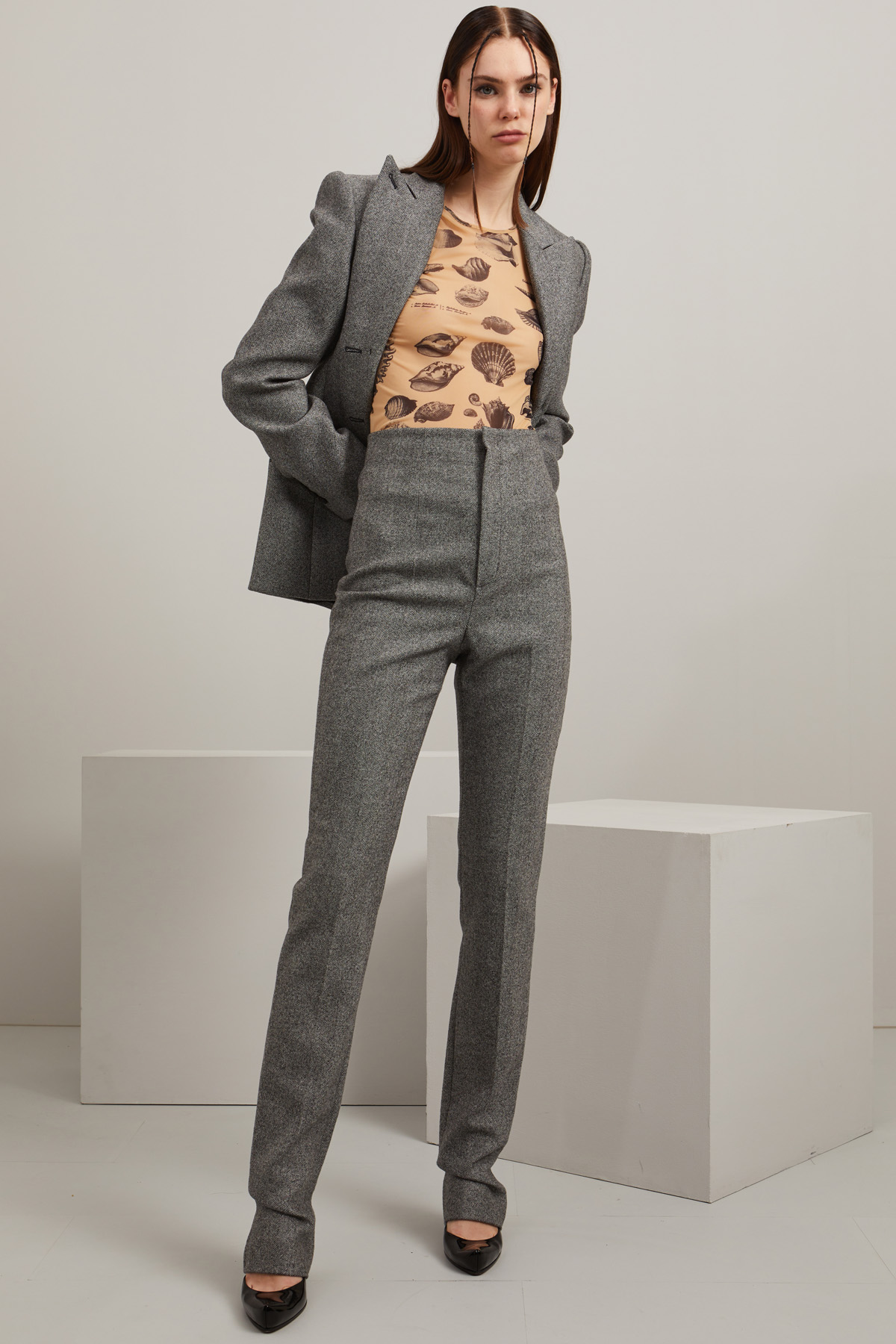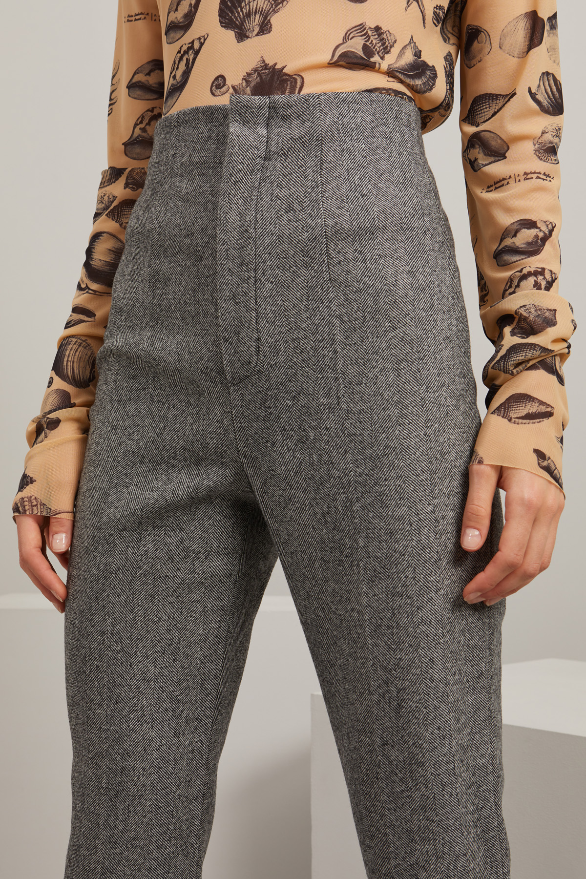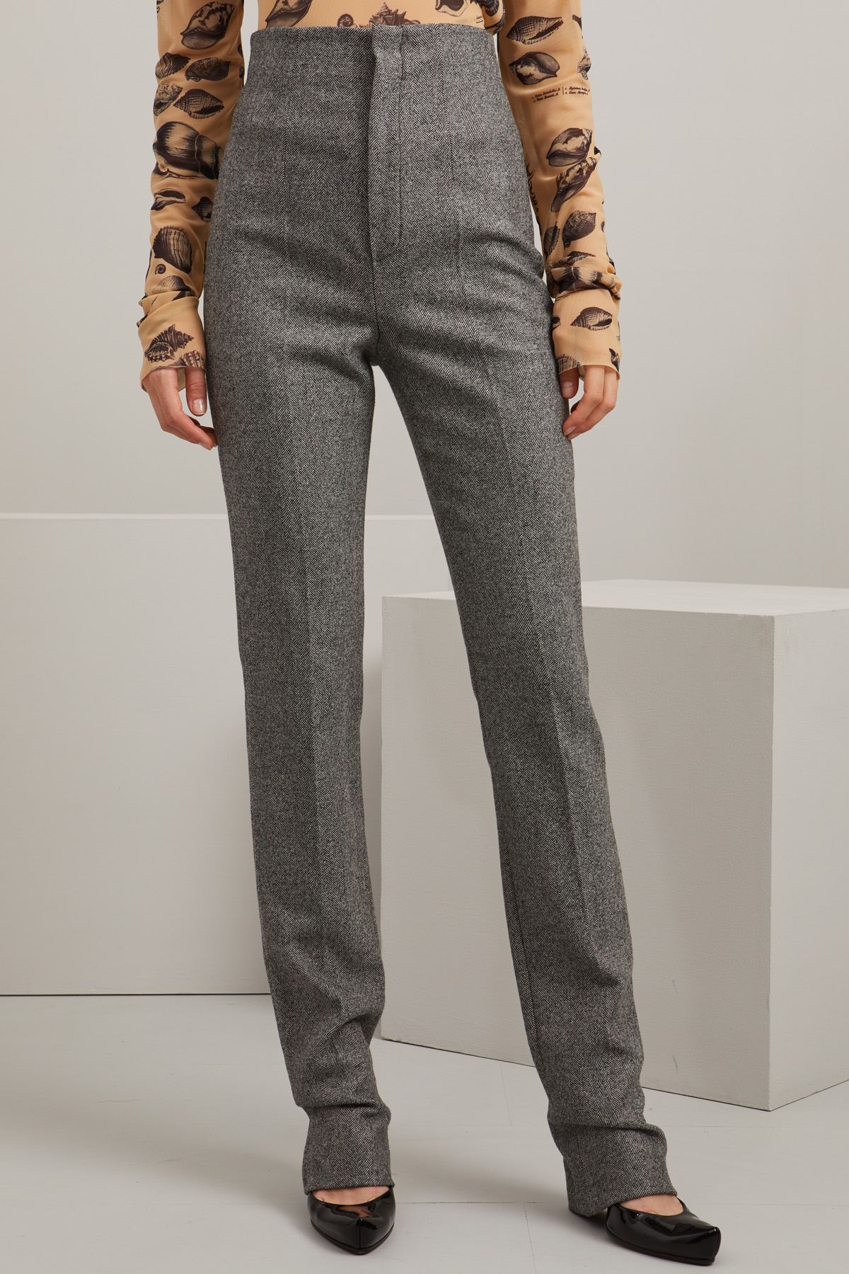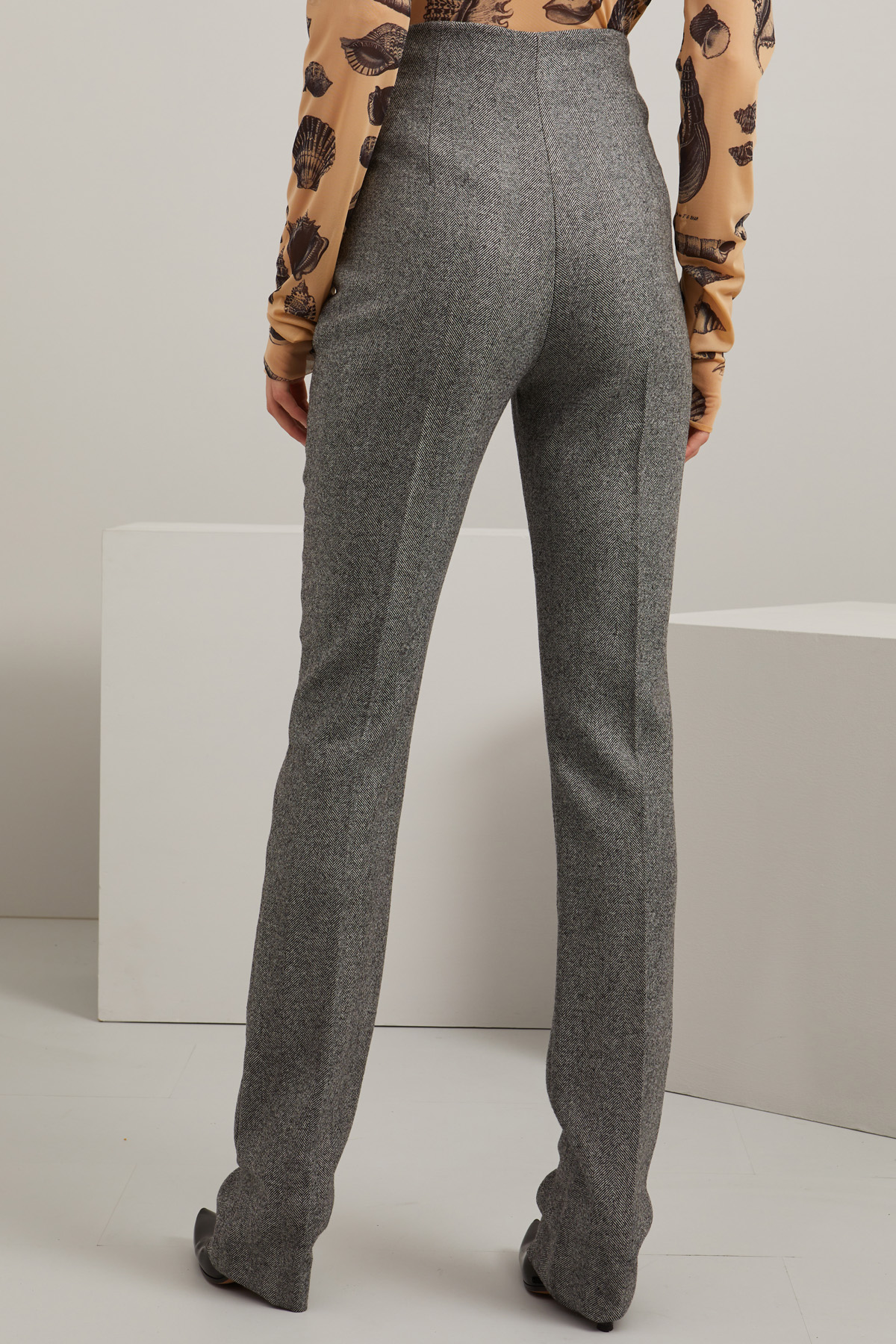 Pantaloni a sigaretta realizzati in tessuto a lisca di pura lana con vita alta e piega stirata in lunghezza. Allacciatura nascosta tramite zip, bottone e gancio.