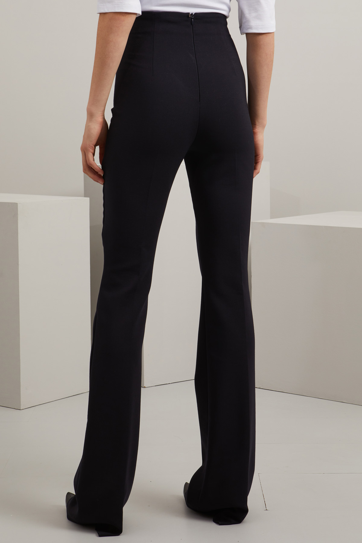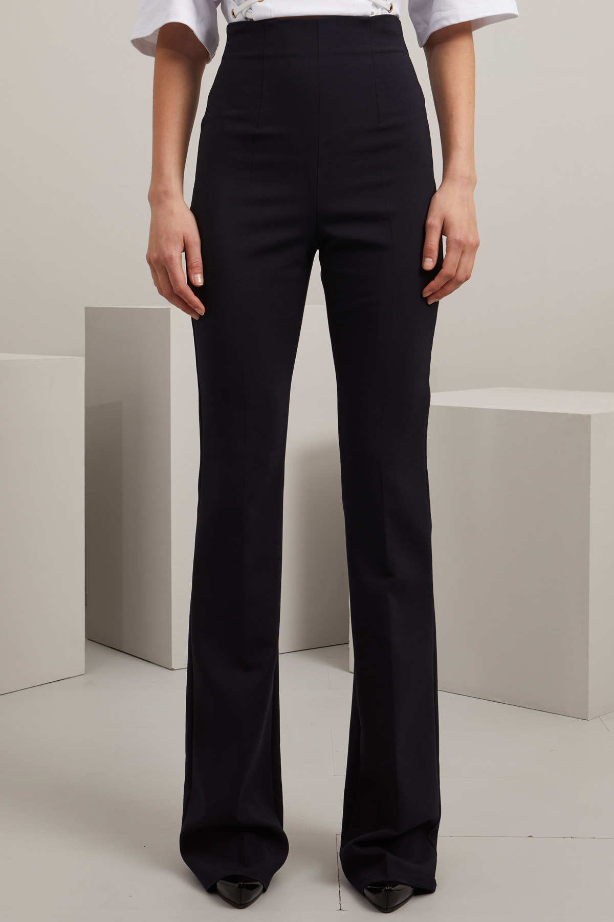 Pantaloni a vita alta dalla linea flare realizzati in tela di lana stretch, con piega stirata e allacciatura tramite zip invisibile nel retro.