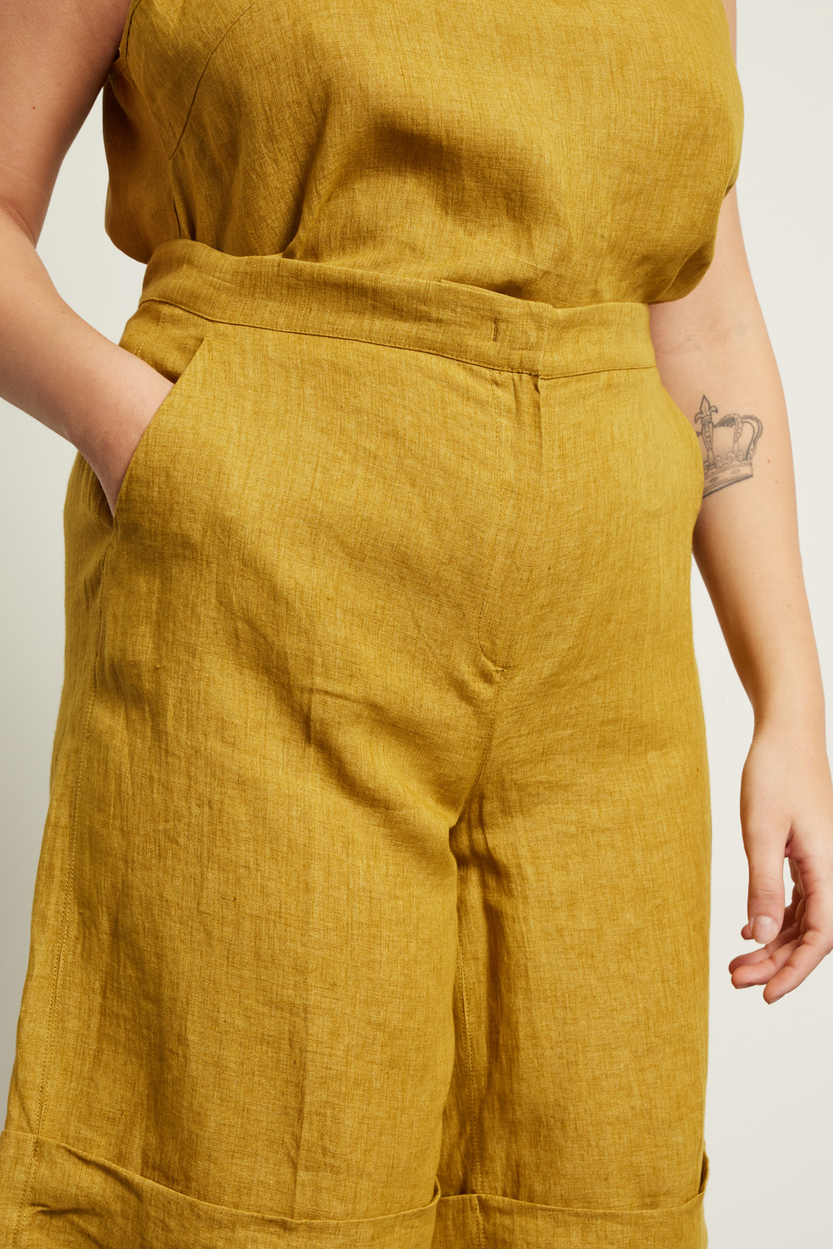 Bermuda dalla linea dritta realizzati in tela di puro lino con cintone in vita, tasche alla francese, piega stirata in lunghezza e risvolto al fondo. Allacciatura nascosta tramite zip, gancio e bottone.