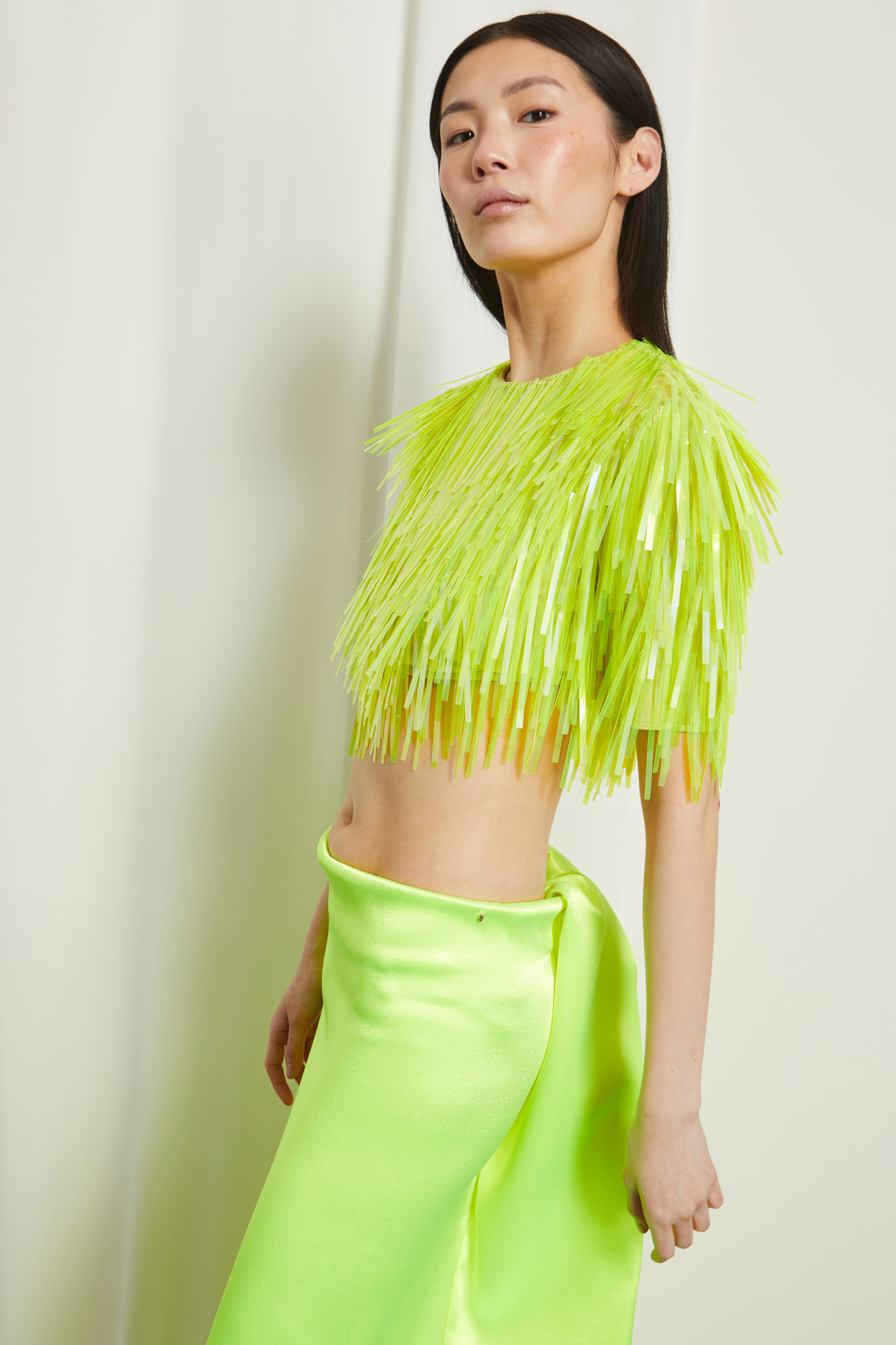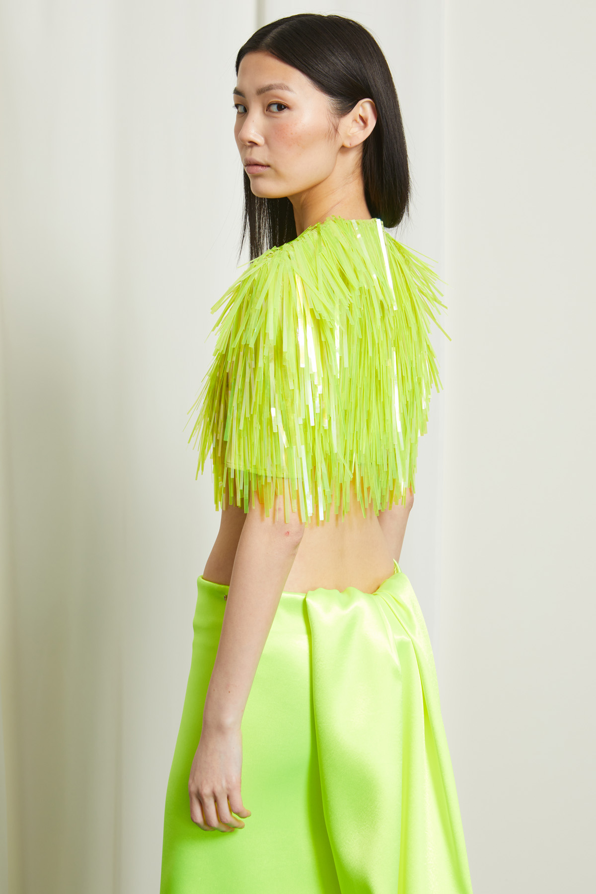Crop top dalla linea dritta realizzato in crépe de chine con pailettes allungate e perline ricamate all over, scollo a giro e maniche corte. Allacciatura tramite zip invisibile nel retro.