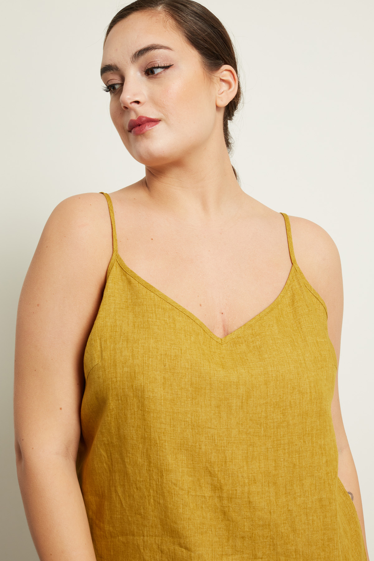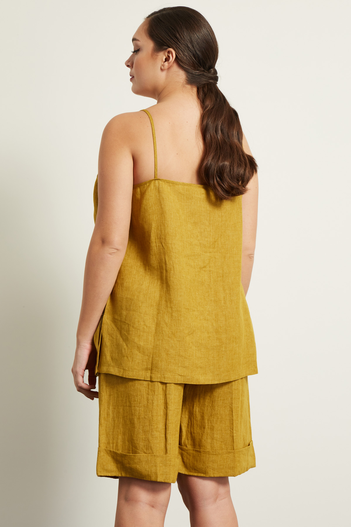 Top dalla linea dritta realizzato in tela di lino, con scollo a V, spallini sottili e spacchetti laterali al fondo.