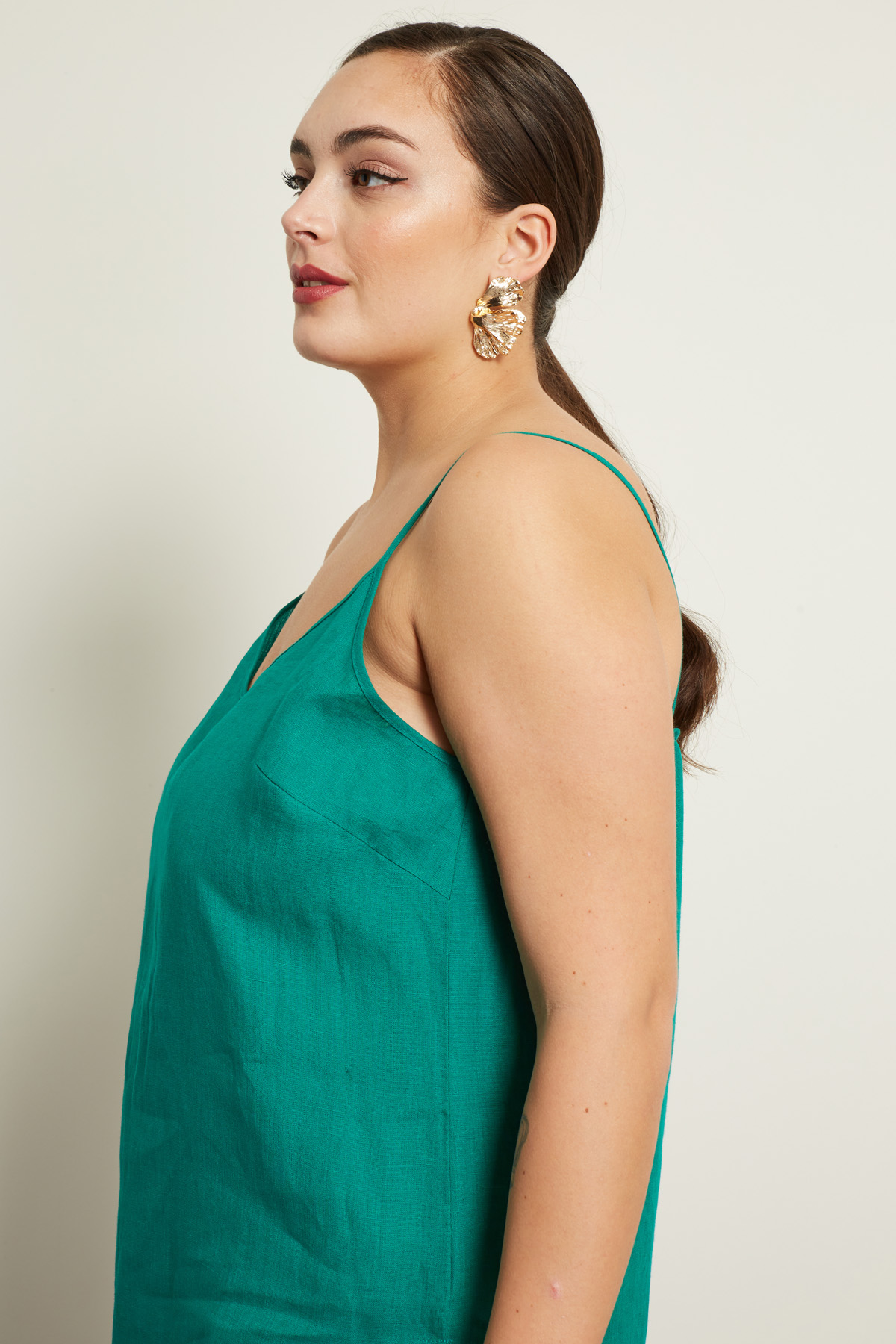 Top dalla linea dritta realizzato in tela di lino, con scollo a V, spallini sottili e spacchetti laterali al fondo.