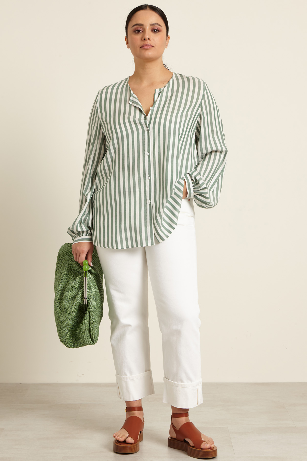 - La modella è alta 174 cm e indossa la taglia 21. Le sue misure sono: seno 98 cm, vita 75 cm e fianchi 104 cm