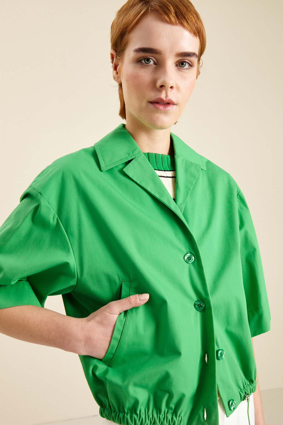 Giacca corta dalla linea over realizzata in popeline di puro cotone, con collo a rever, maniche corte a campana, tasche oblique a filetto, coulisse regolabile a fondo capo e carrè con cannoncino nel retro. Allacciatura monopetto tramite bottoni a vista. Sfoderato.