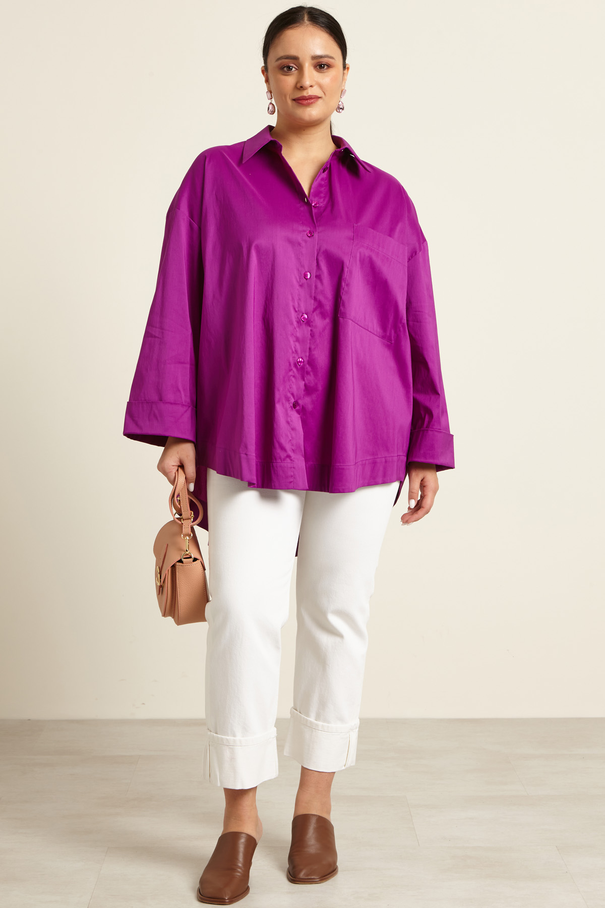 Camicia dalla line morbida realizzata in raso di misto cotone, con colletto classico, maniche lunghe dal giro sceso e polsino con risvolto, taschino applicto su petto, carrè e cannoncino nel retro. Allacciatura tramite bottoni.