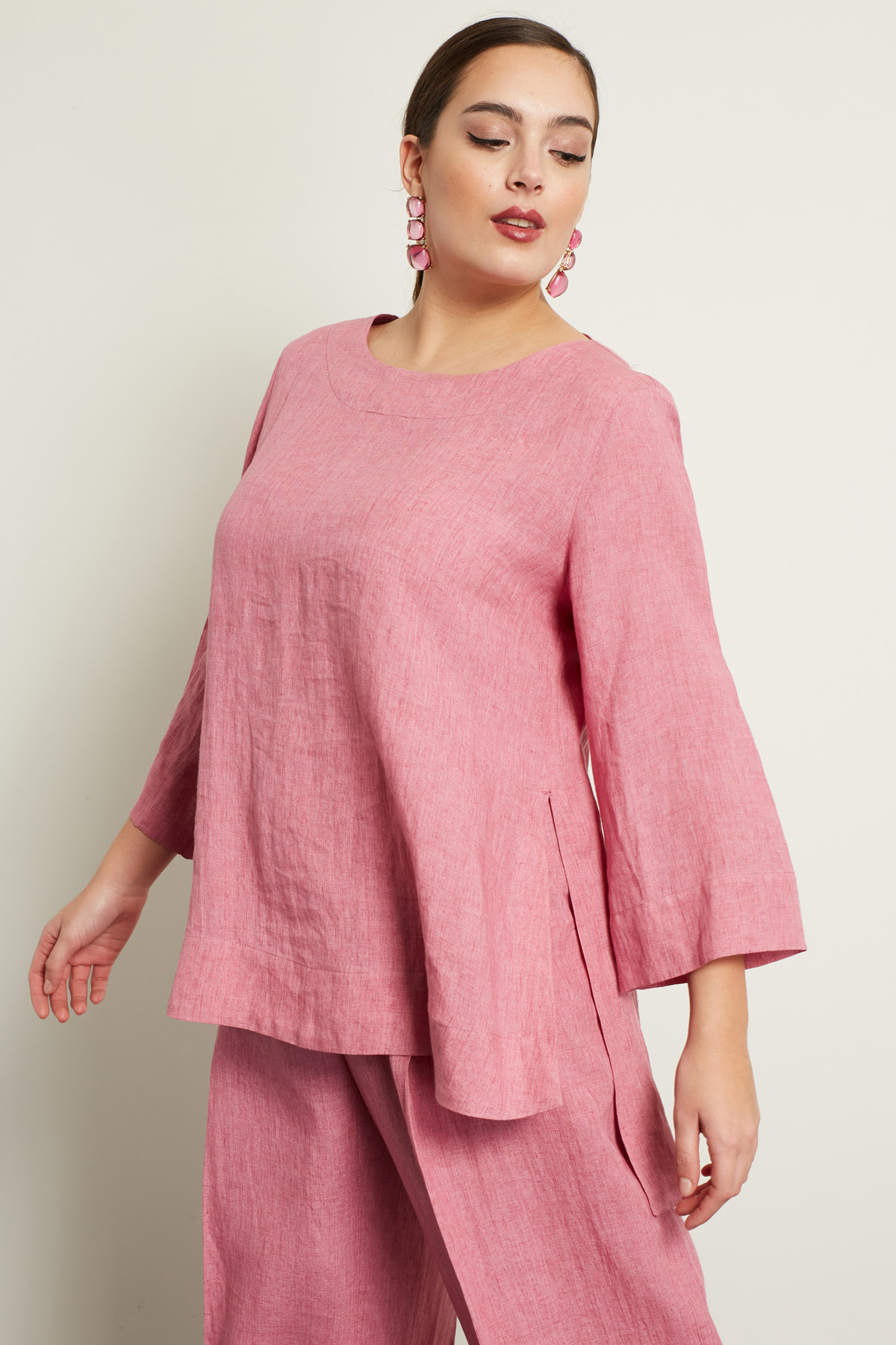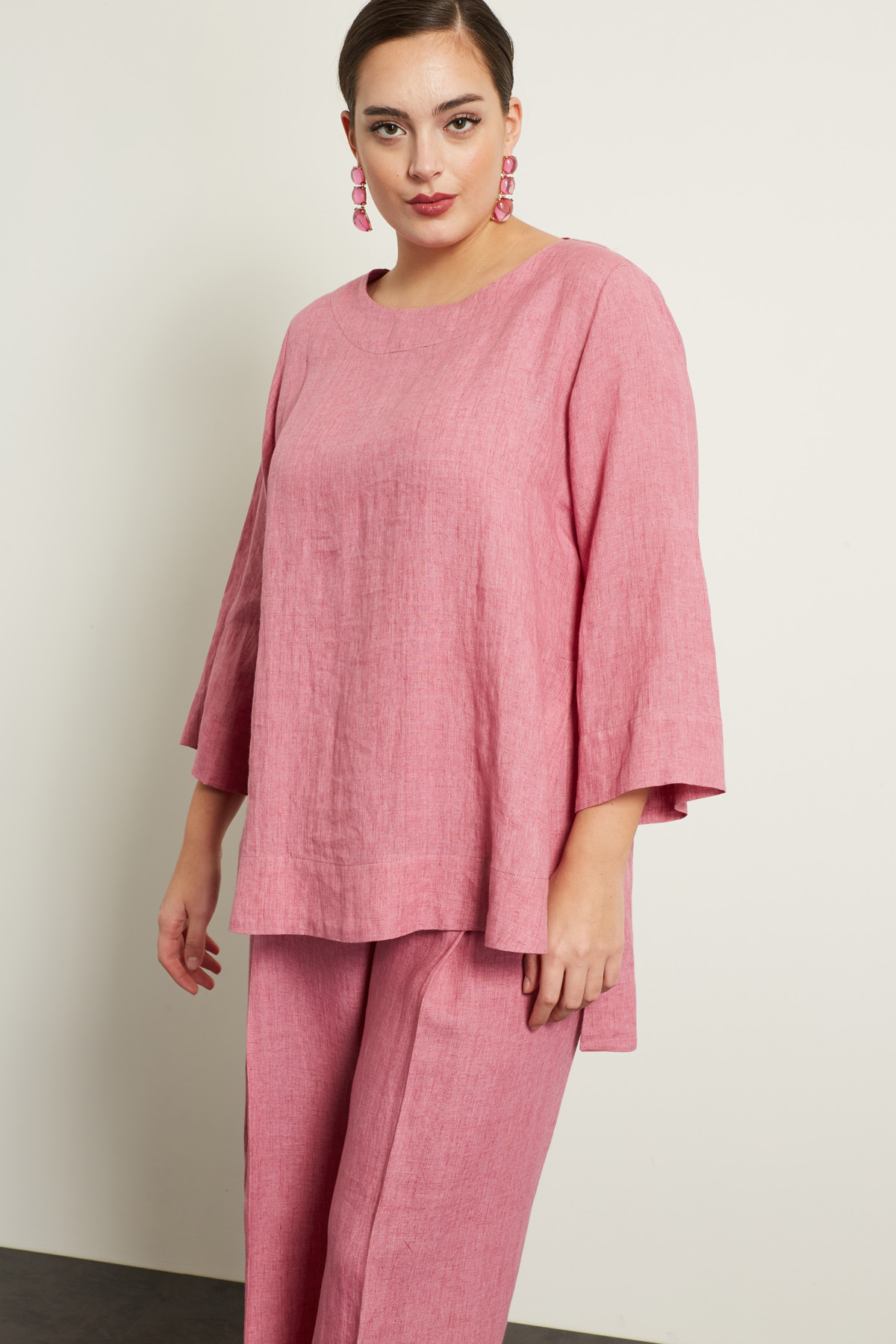 Casacca dalla linea dritta realizzata in tela di puro lino, con scollo a giro, maniche tre quarti e spacchi laterali al fondo.