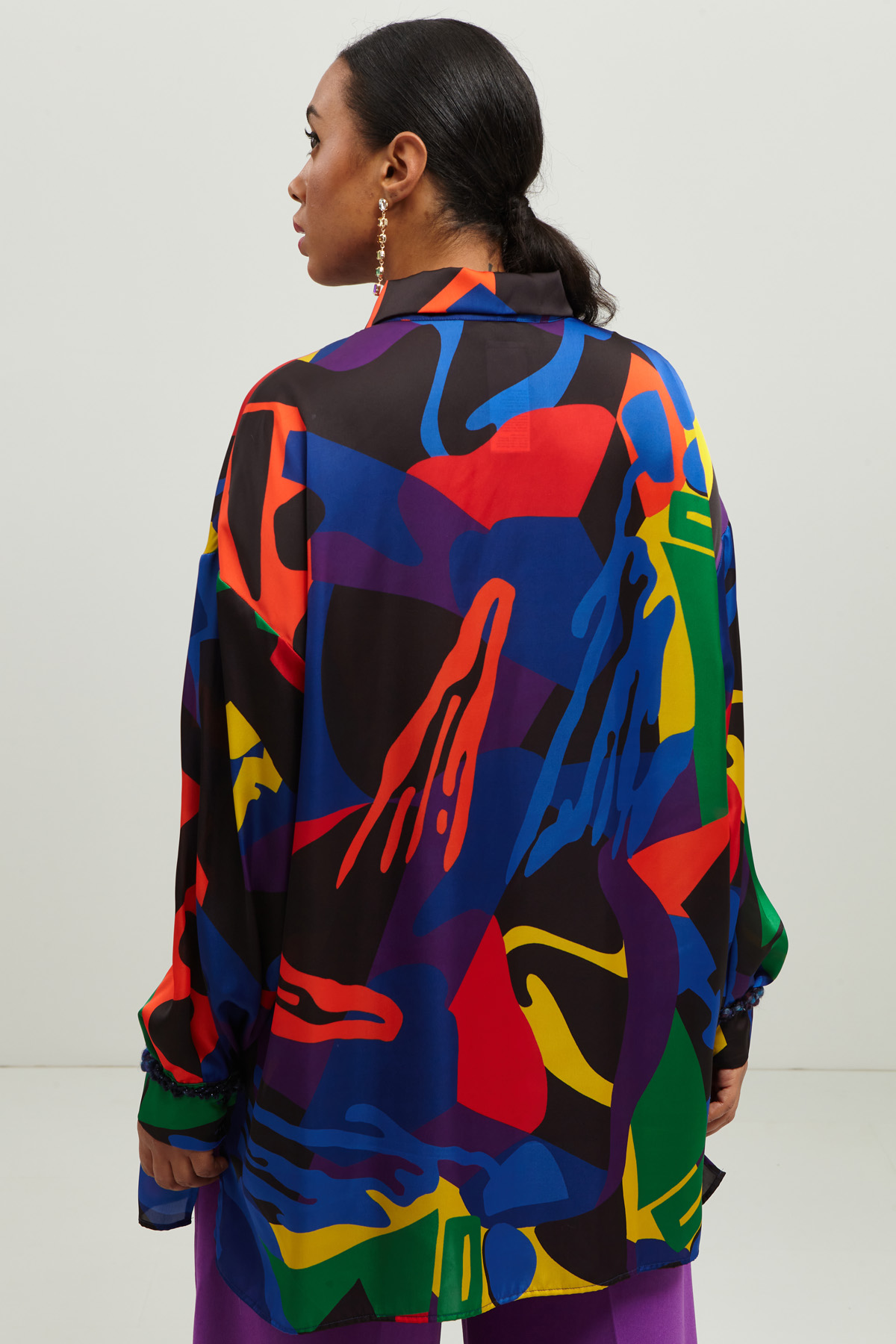 Camicia dalla linea dritta realizzata in raso leggero stampato, con colletto classico, maniche lunghe con polsino rifinito da passamaneria con bottoni, spacchetti al fondo e allacciatura tramite bottoni a vista.